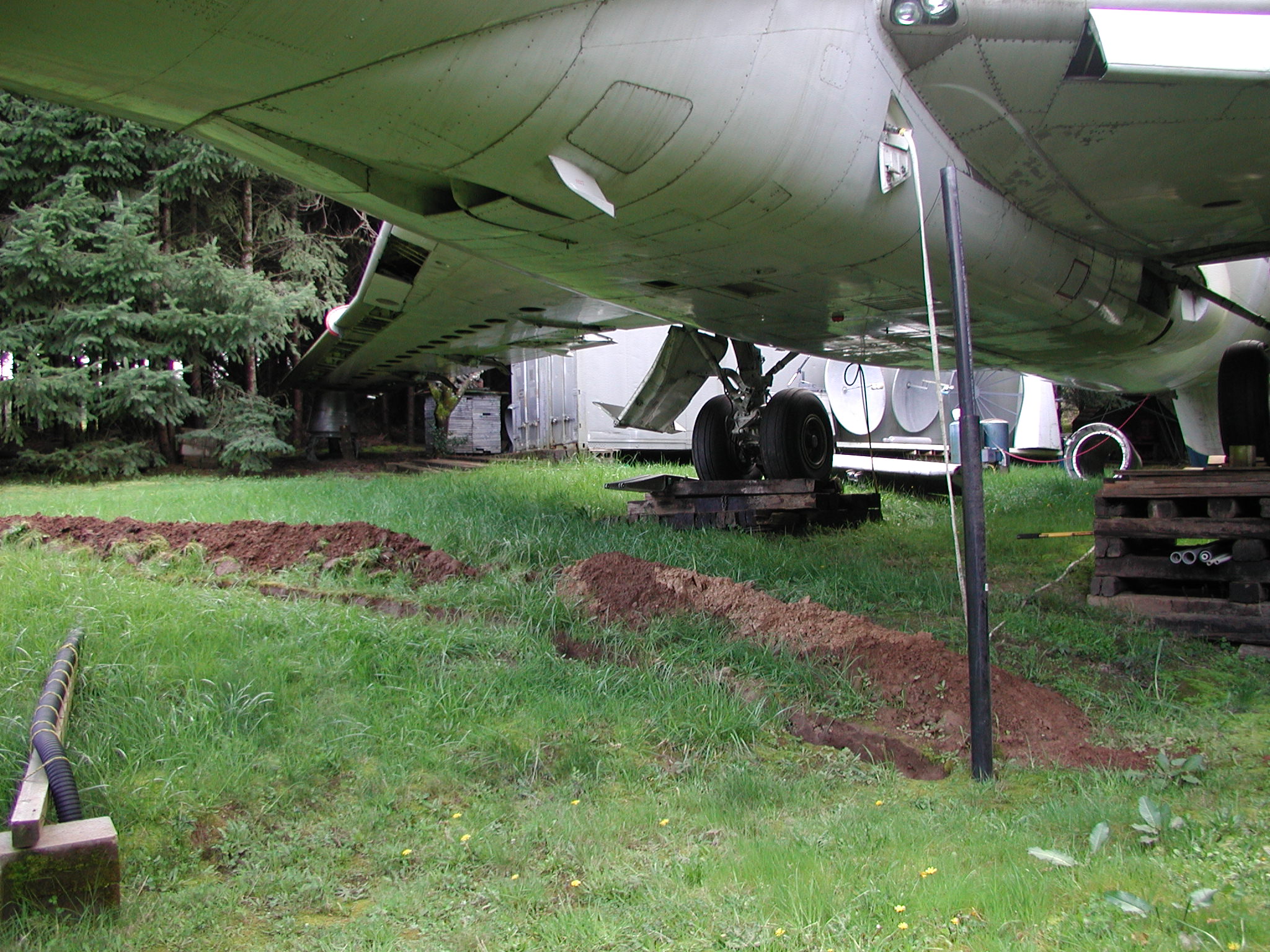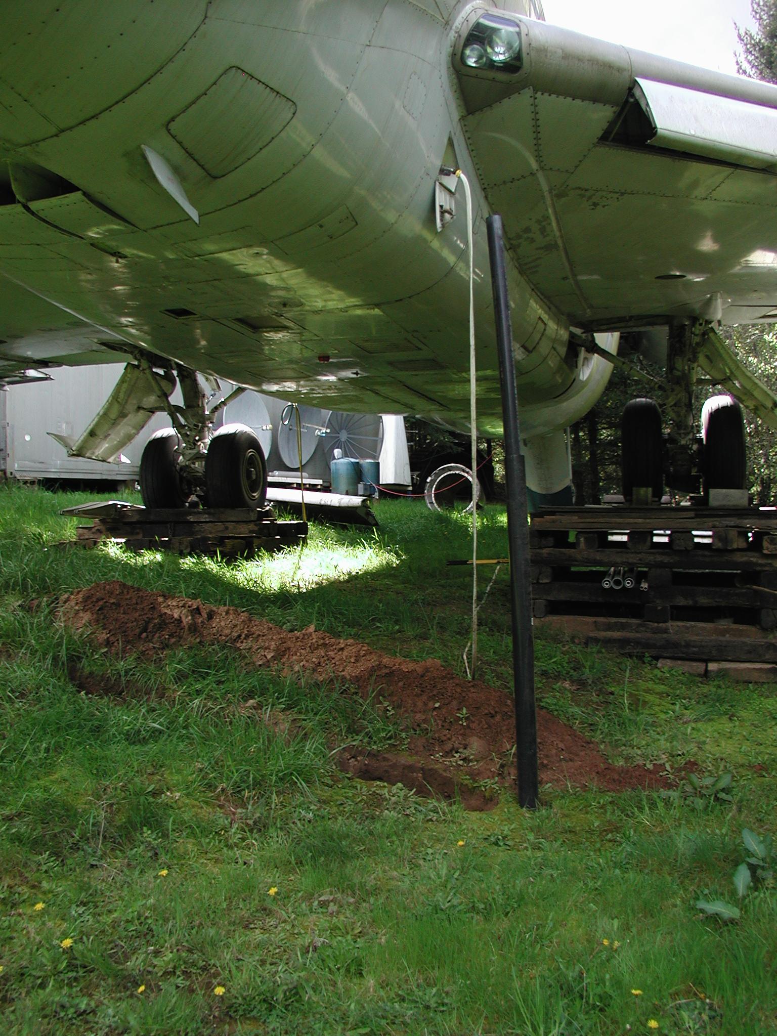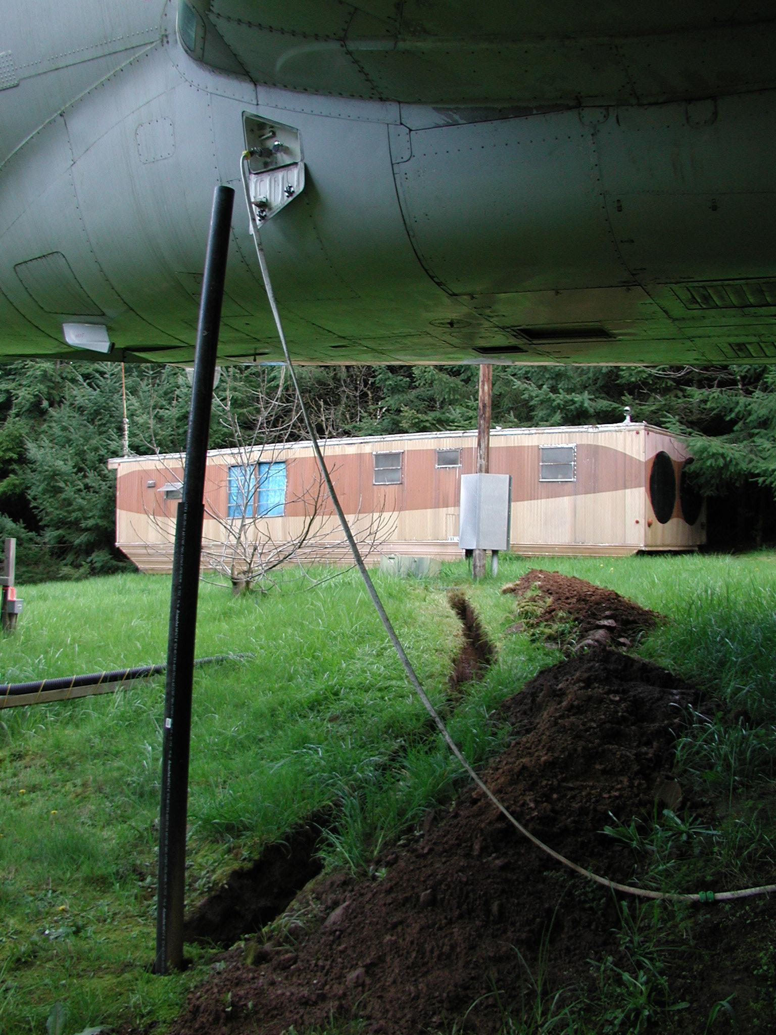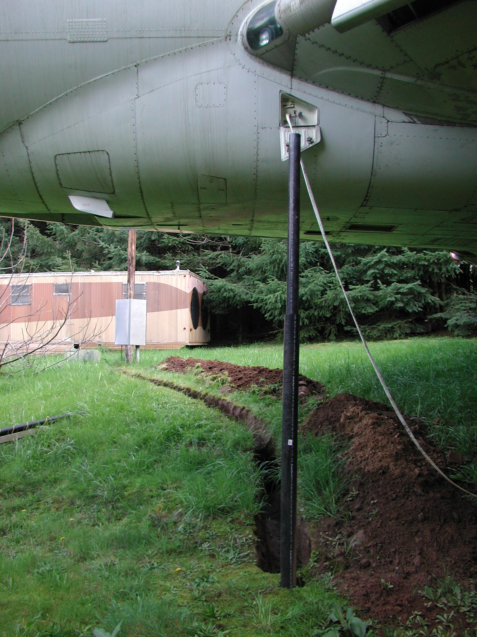 Here's a description of the work so far: I dug a two foot deep trench from the electric meter base to a roughly five foot deep post hole, which I dug just beneath the water service port on the left side of the aircraft, just below the leading edge of the wing. The trench intersects the old underground water line and water well's power cable that used to serve the mobile home (which used to be located roughly underneath the aircraft's current position). I also acquired water pipe, 4" and smaller schedule 80 gray PVC electrical conduit, and other plumbing components.