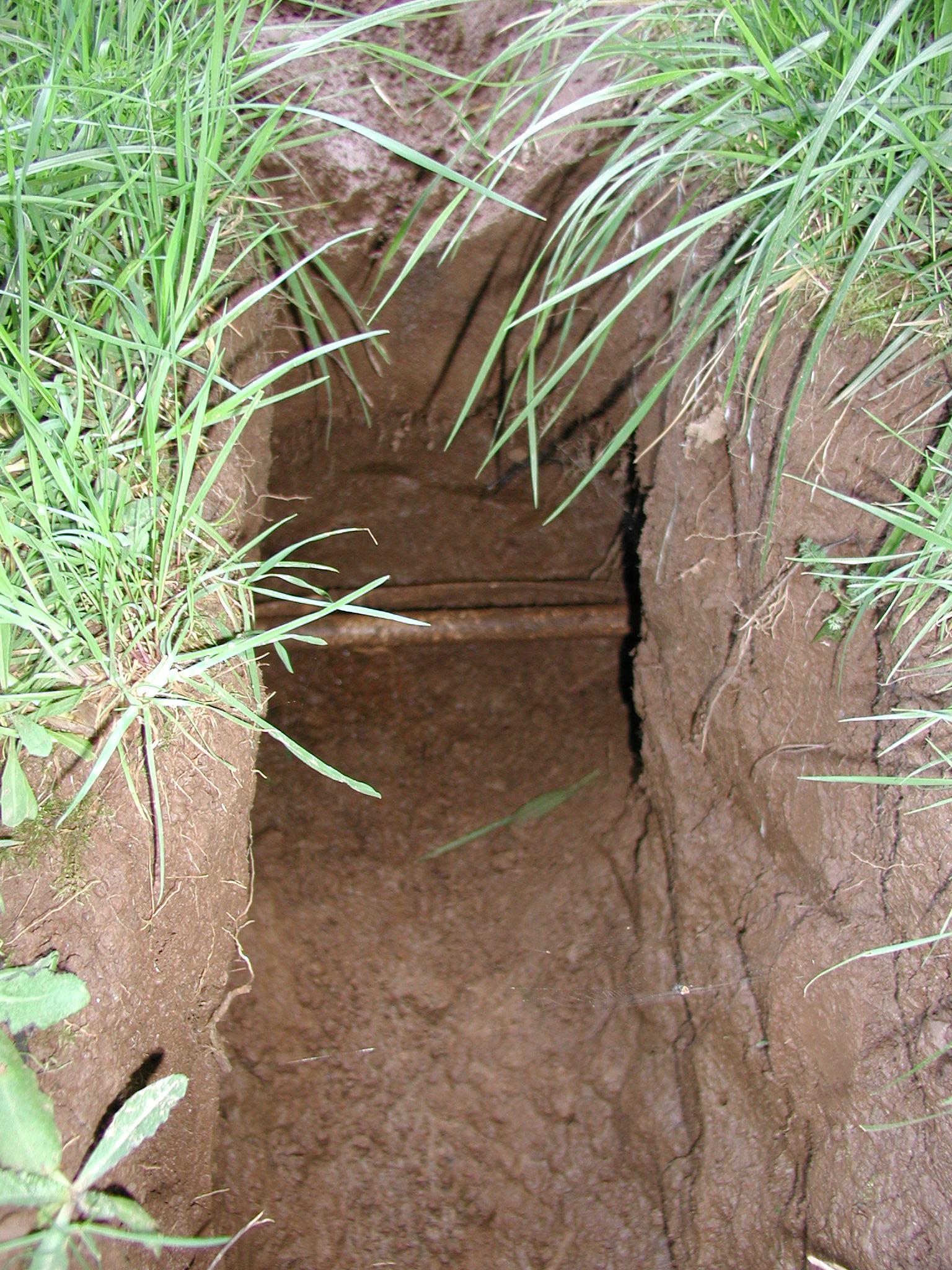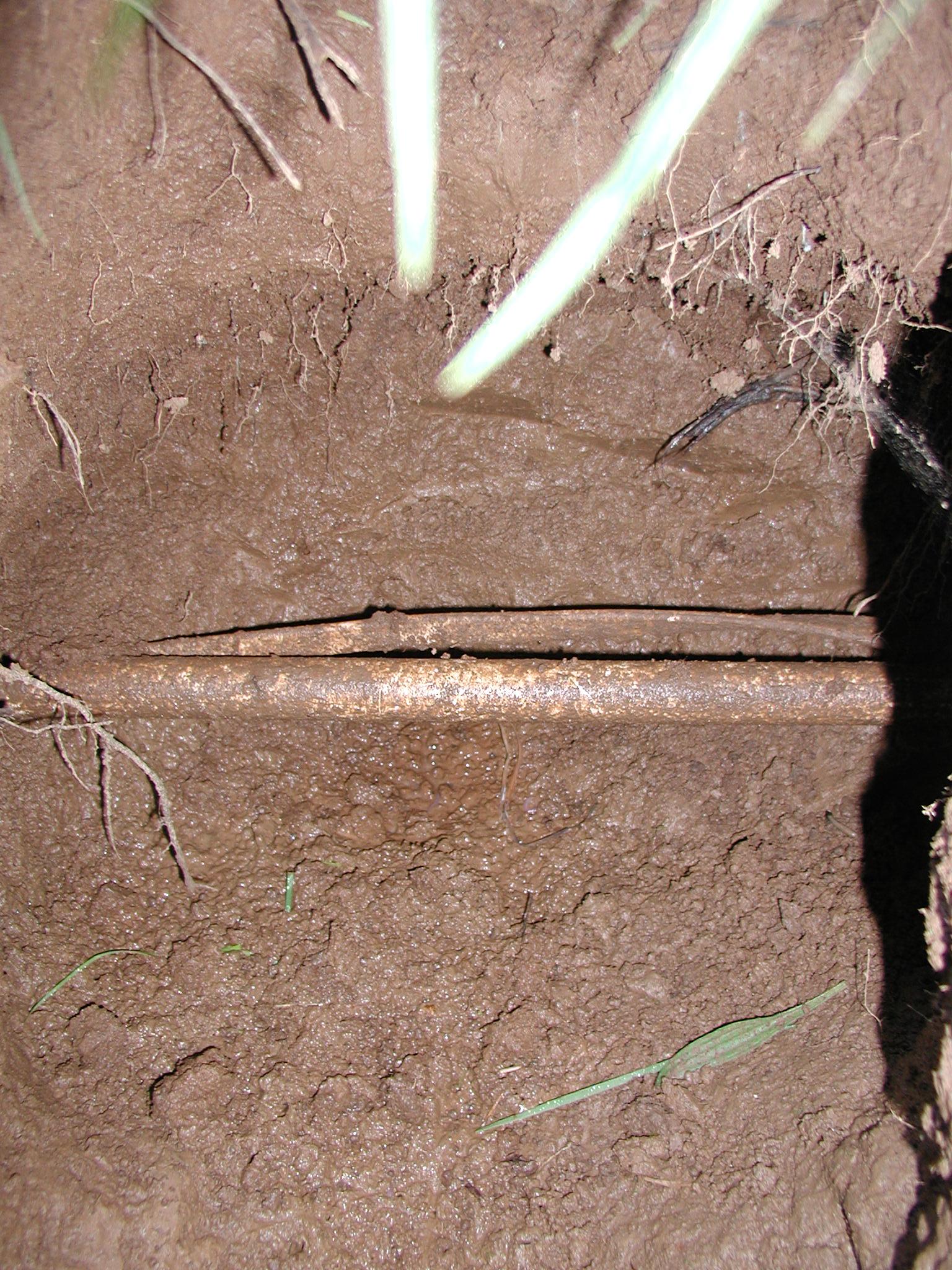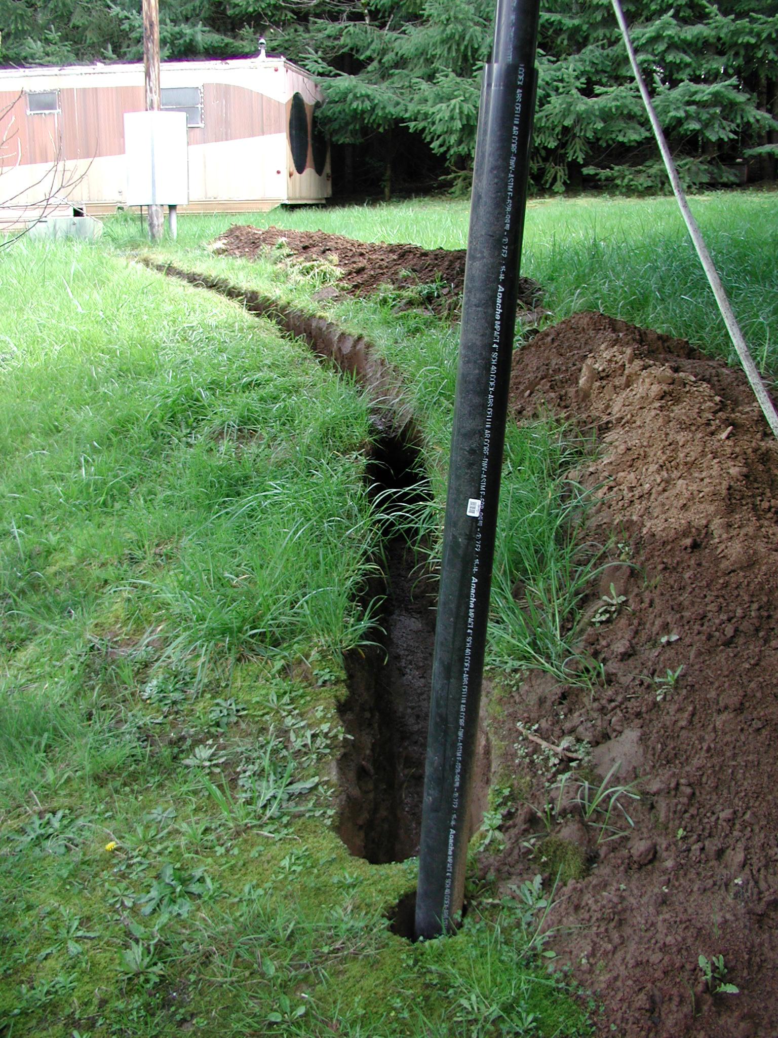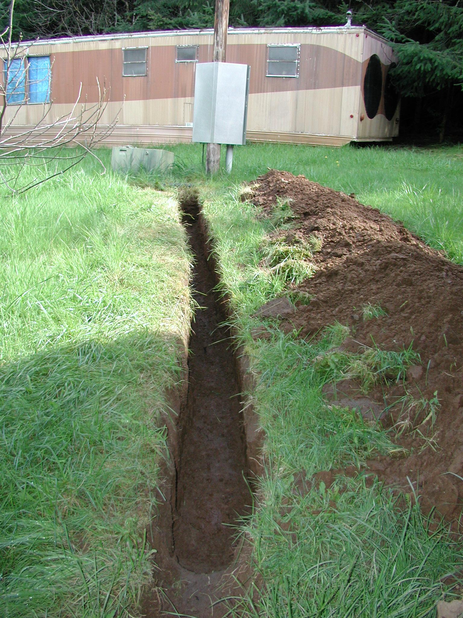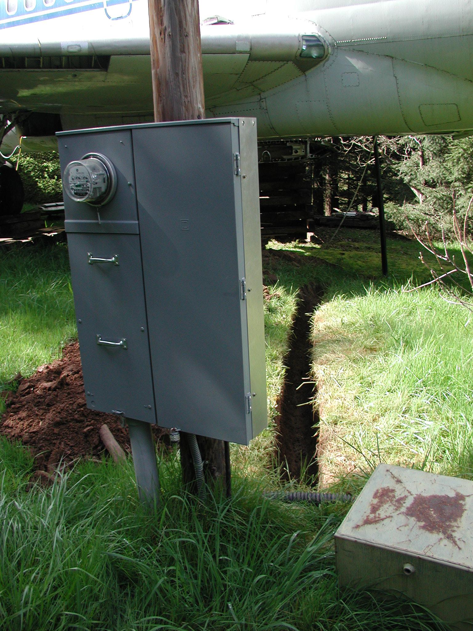 Here's a description of the work so far: I dug a two foot deep trench from the electric meter base to a roughly five foot deep post hole, which I dug just beneath the water service port on the left side of the aircraft, just below the leading edge of the wing. The trench intersects the old underground water line and water well's power cable that used to serve the mobile home (which used to be located roughly underneath the aircraft's current position). I also acquired water pipe, 4" and smaller schedule 80 gray PVC electrical conduit, and other plumbing components.