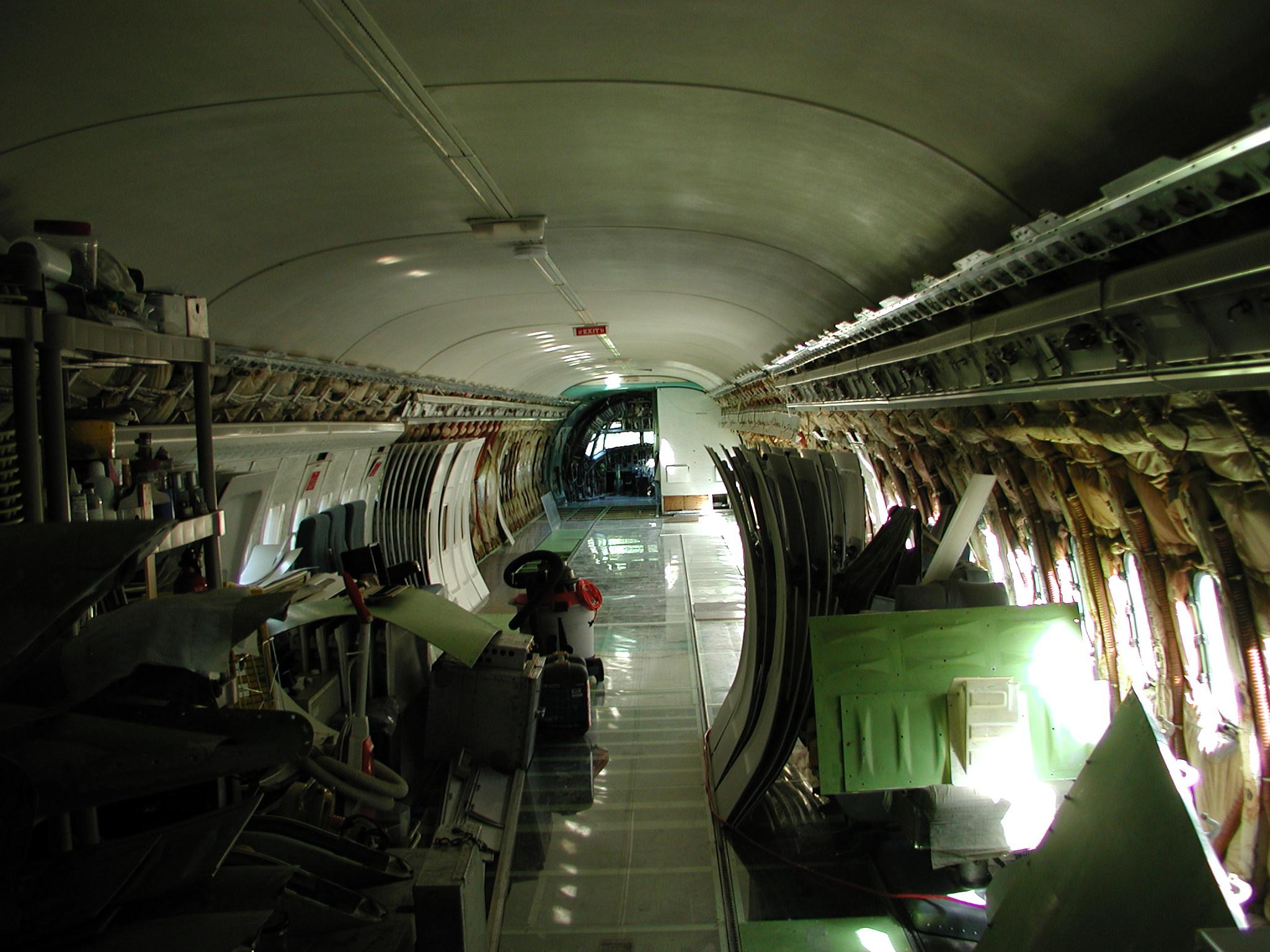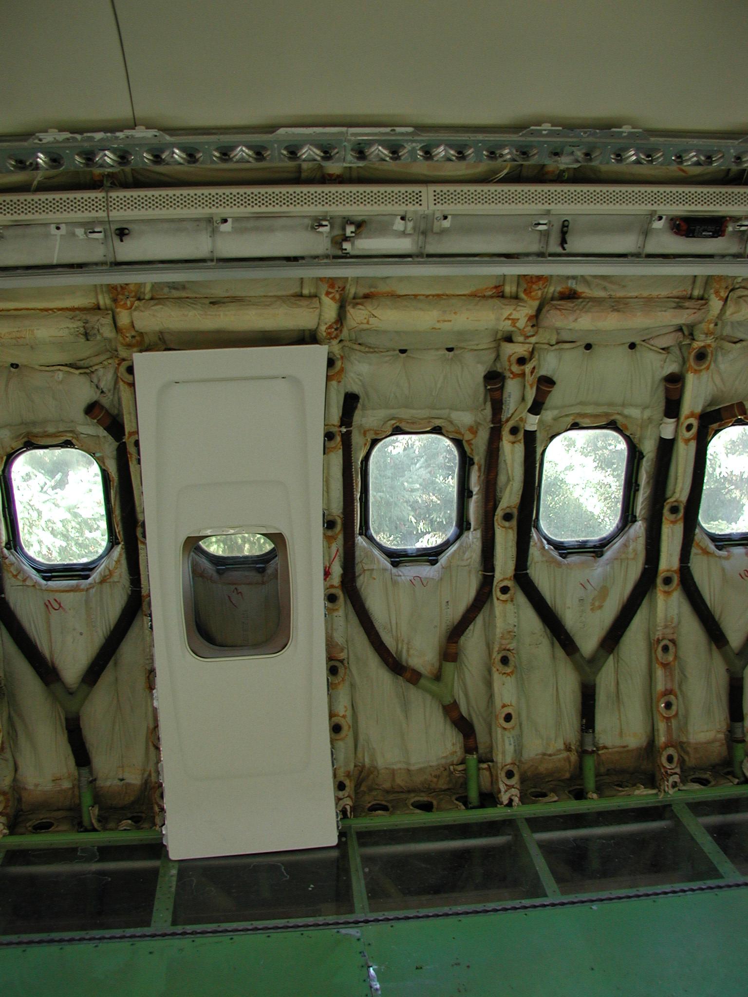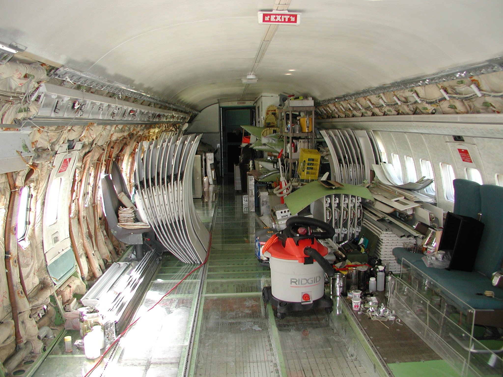 I've also been busting butt to clean the entire electronics bay and the front landing gear interior belly area. The belly area in the electronics bay was the home a large quantity of belly glop, which is now thoroughly gone, along with it's odor. I had to remove all the floor panels and insulation to get to it. Most of this cleaning is now complete (but not all). For this aircraft, it's been necessary to remove the lower insulation blankets (those from the floor line down) in some areas, including the entire electronics bay, in order to get the areas clean. (This might prove true for other retired airliners too.) In the electronics bay, most of the insulation blankets were in quite bad shape, providing little real insulation, they were filthy dirty, and they made genuine cleaning of the area impossible. So I removed them, and discarded the unserviceable and unrepairable ones, of which there were quite a few. I may have to reinsulate the area later (or perhaps not, but that's a complicated story), but what's important now is that the area is squeaky clean - you can move around and work in the area without soiling your hands or clothes, and there's no odor - it's quite nice.