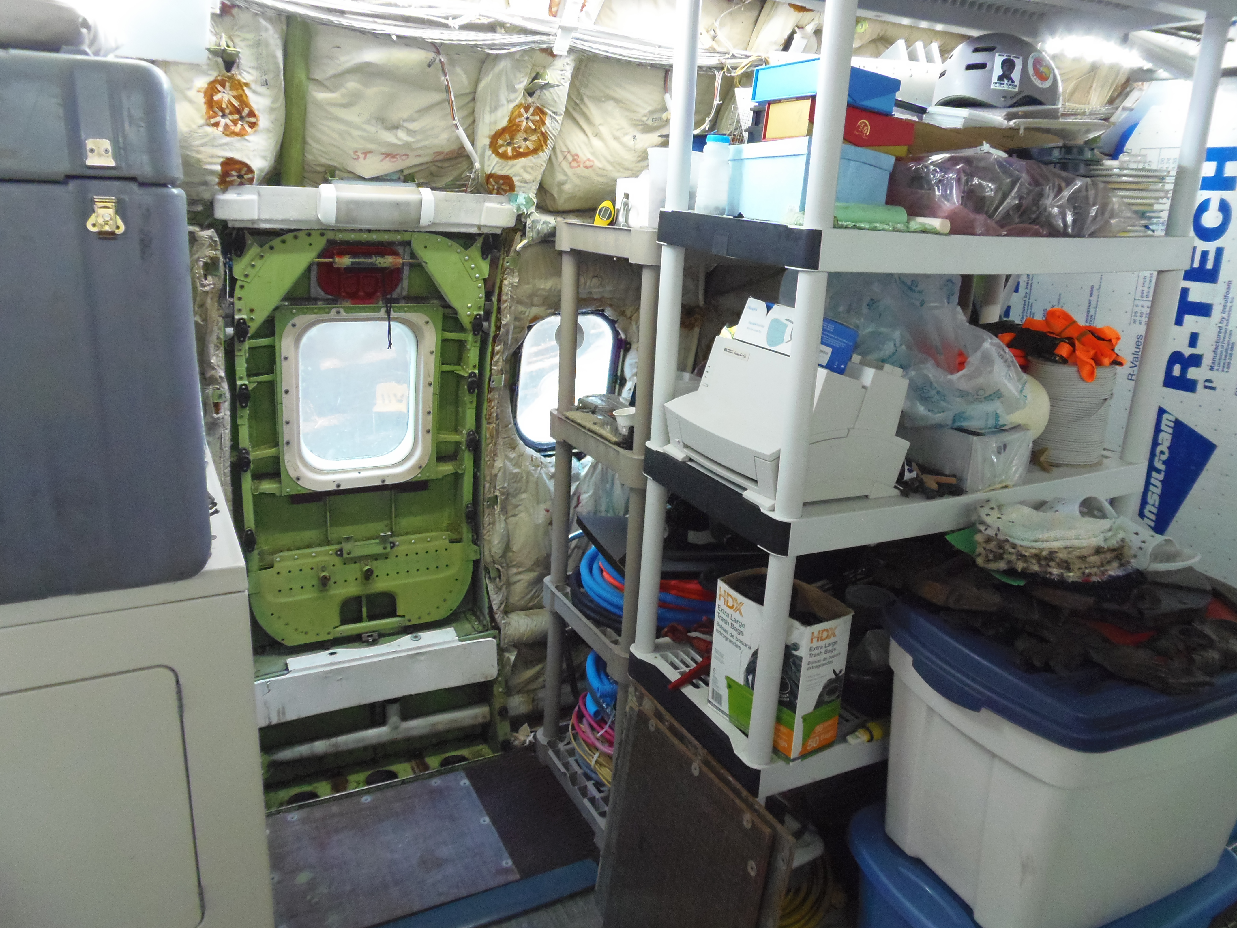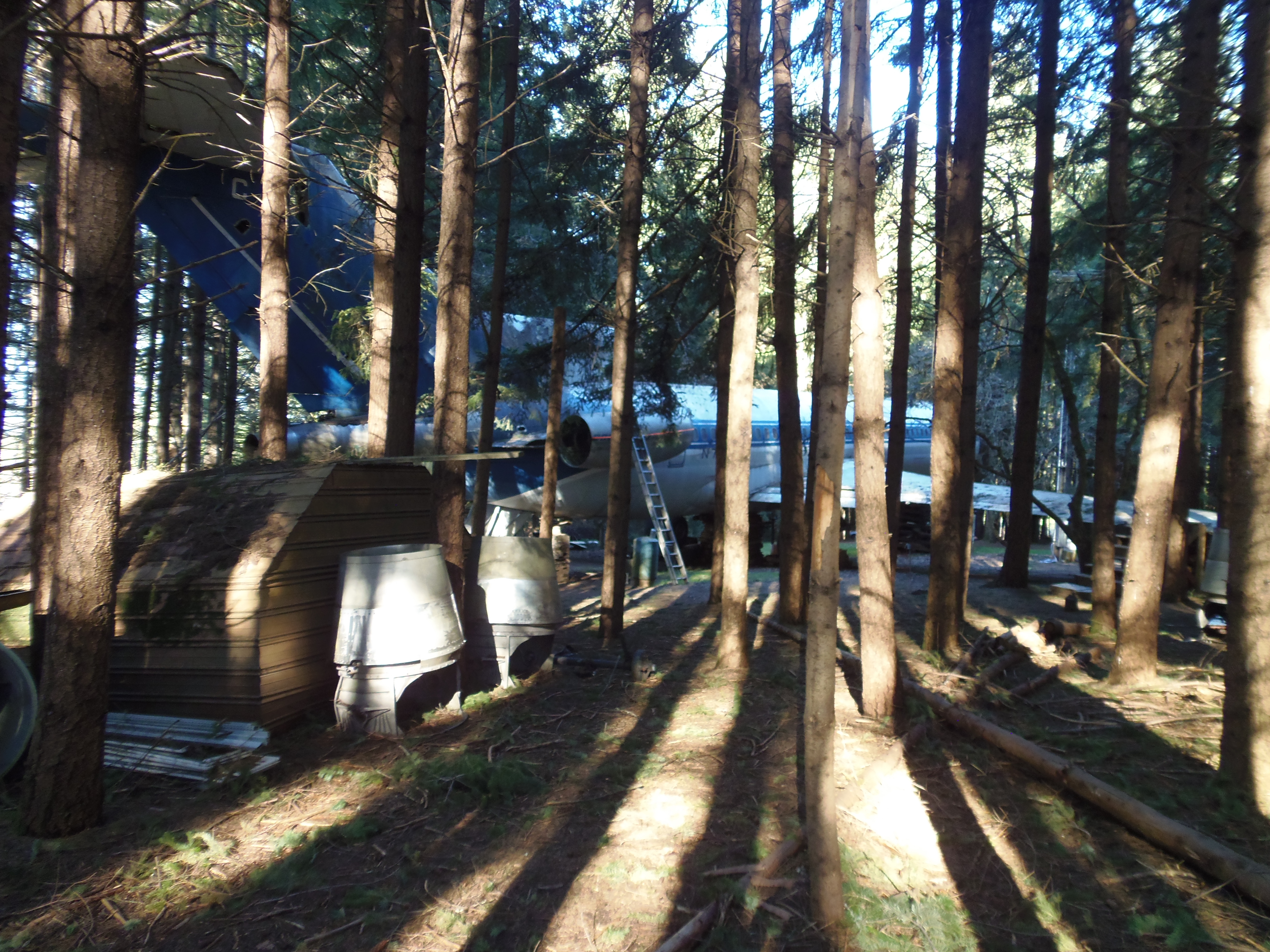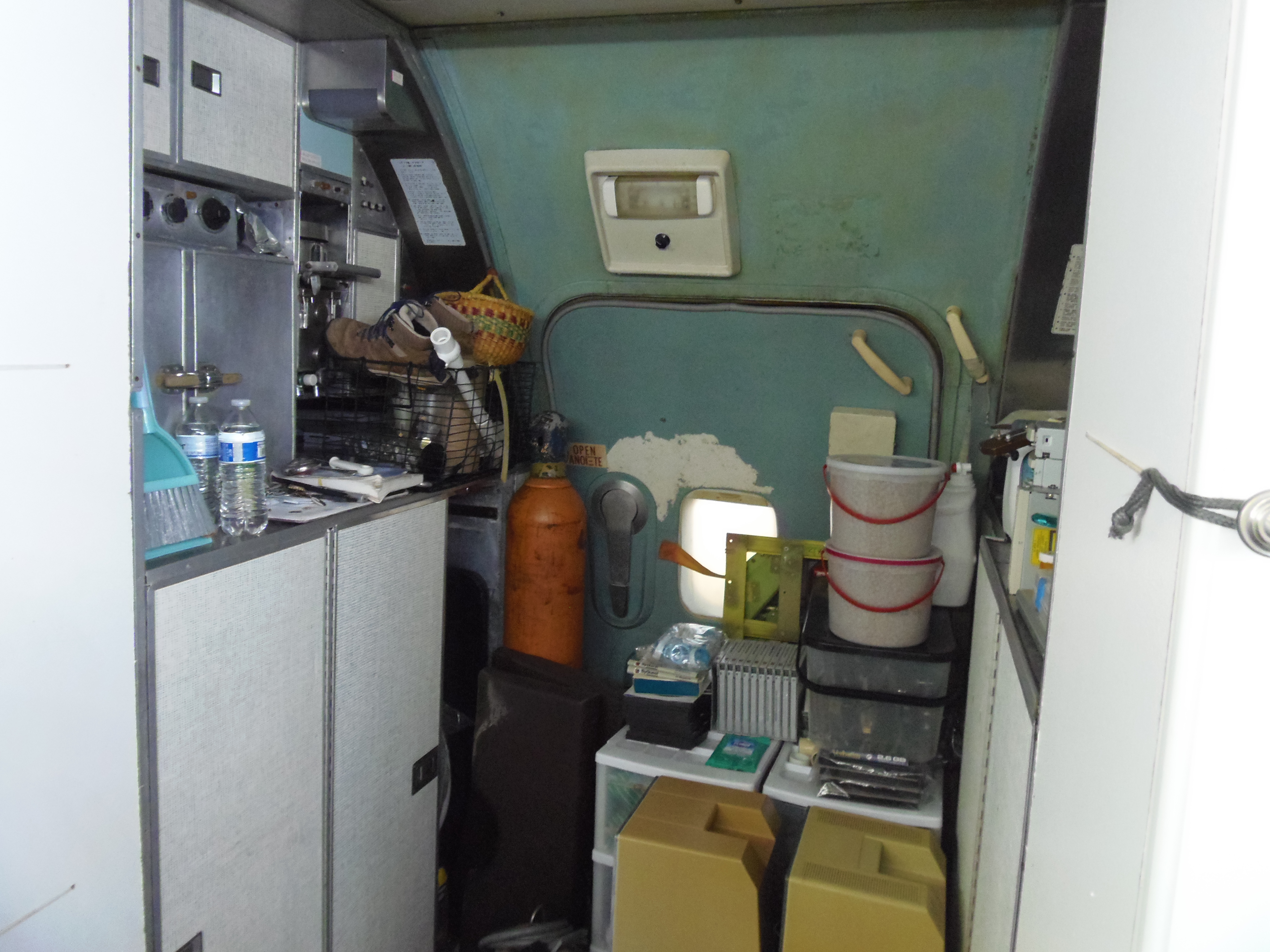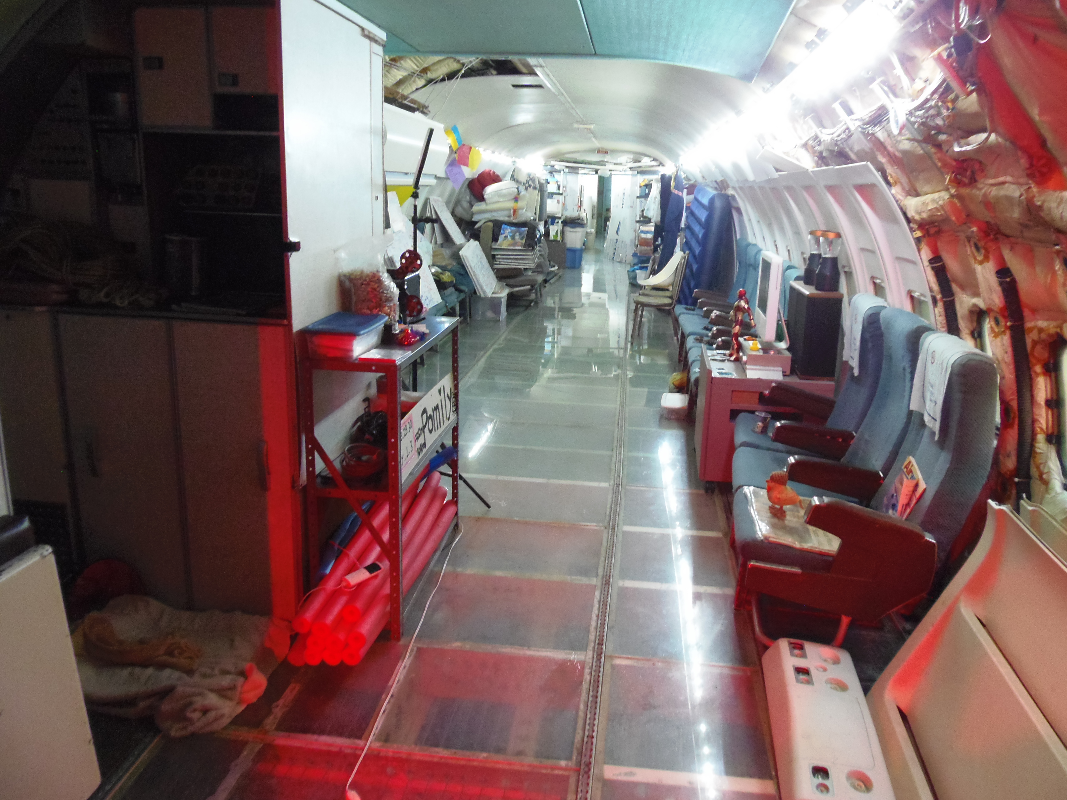 As you can see in the images crude wood, foam panel, and aluminum floor panel stacks which supported the left side and tail area of my fuselage belly during the rebuild of my left landing gear support structure remain in place, awaiting fabrication of a permanent left landing gear support structure. They're ugly and visually obstructive but must remain until the permanent landing gear support structure work is complete. I don't know when that might be...