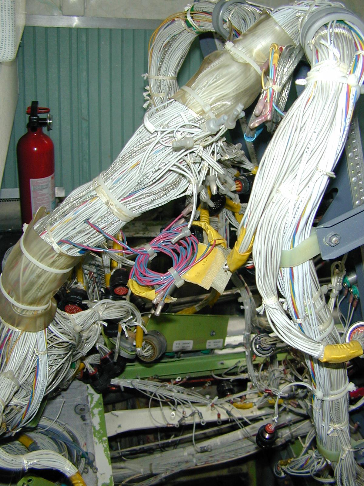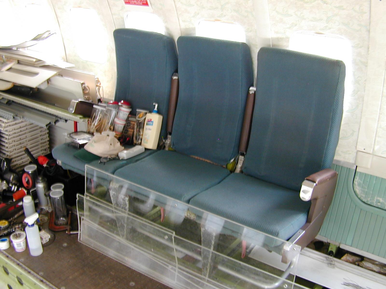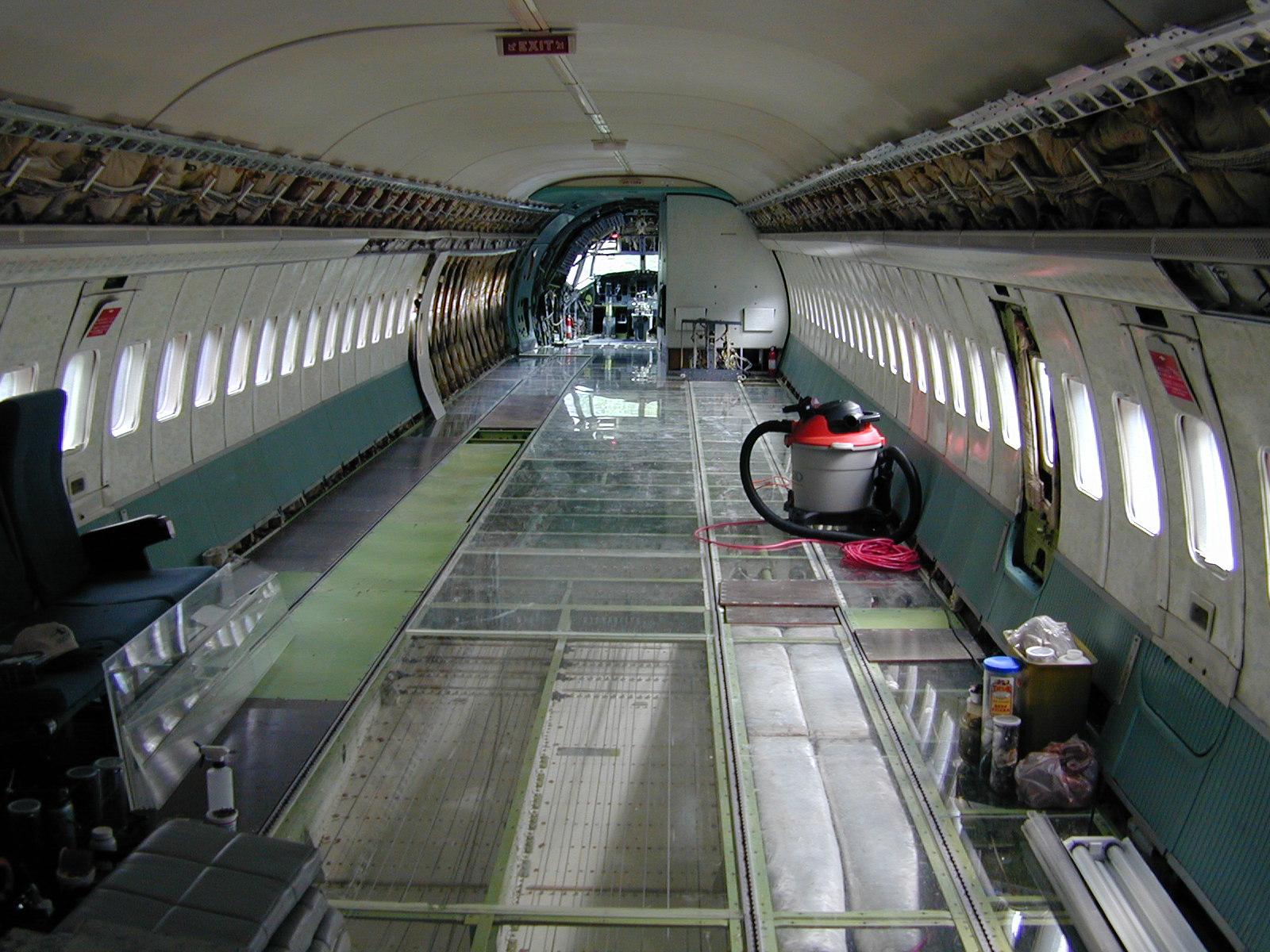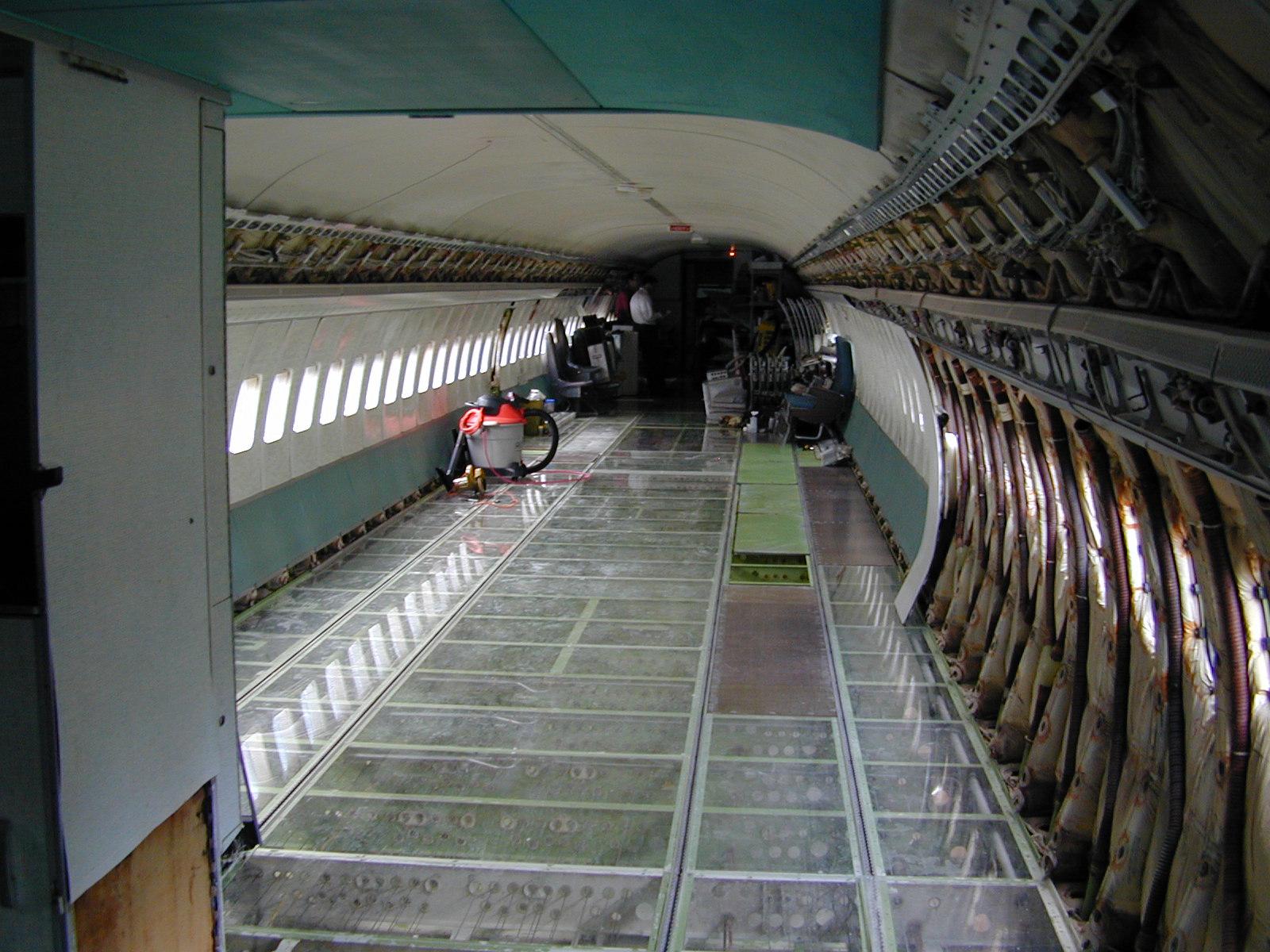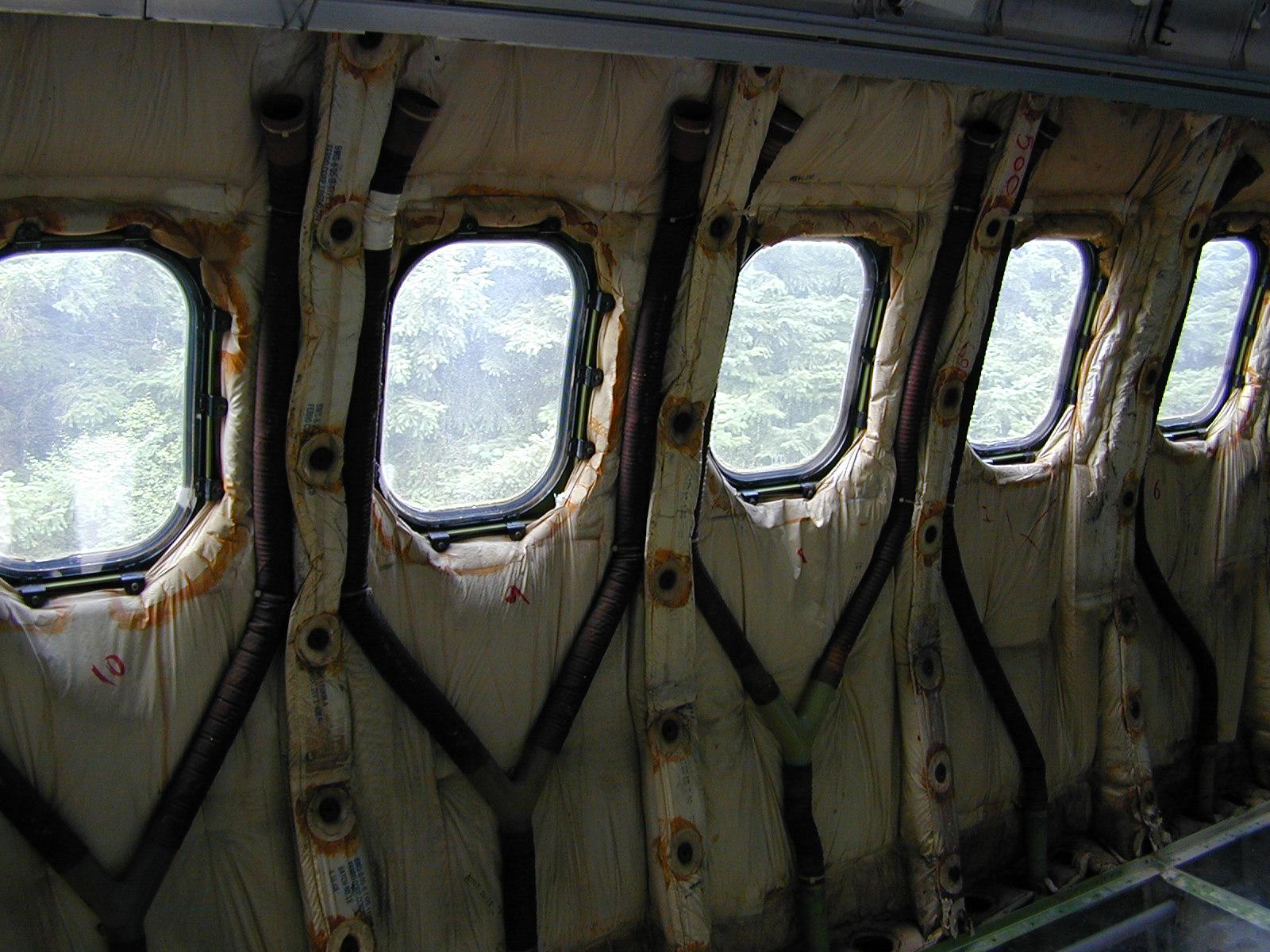 I removed 13 interior side panels in the forward left cabin area as you can see, along with the gasper valve air duct in that area. The fluorescent light tunnel has been disconnected, but not yet moved up. And the oxygen line hasn't been removed yet. All this is in preparation for installation of the nice looking modern style side panels. The plan is to try to complete this update in the forward half of the fuselage this year, and the aft half next year.