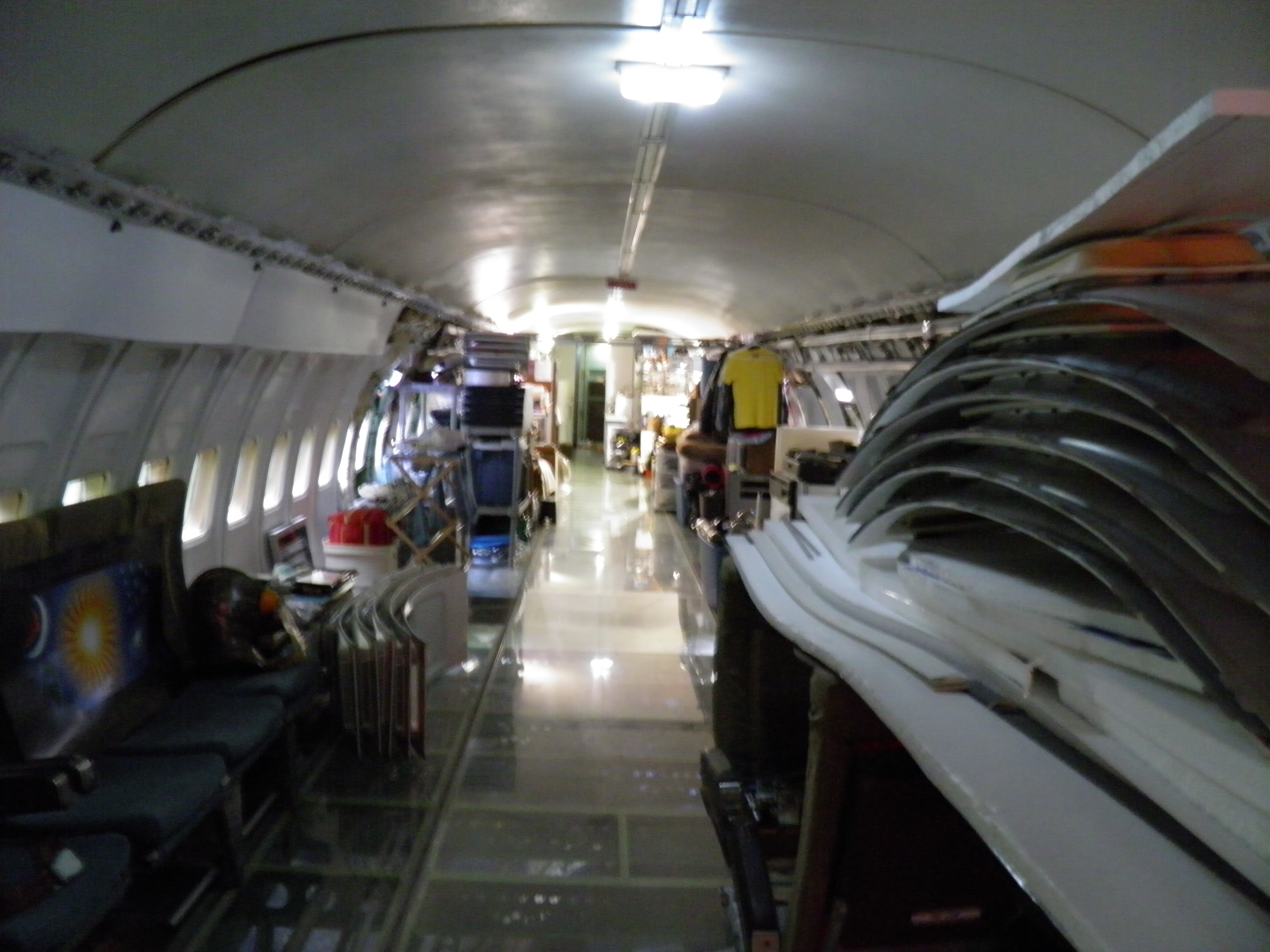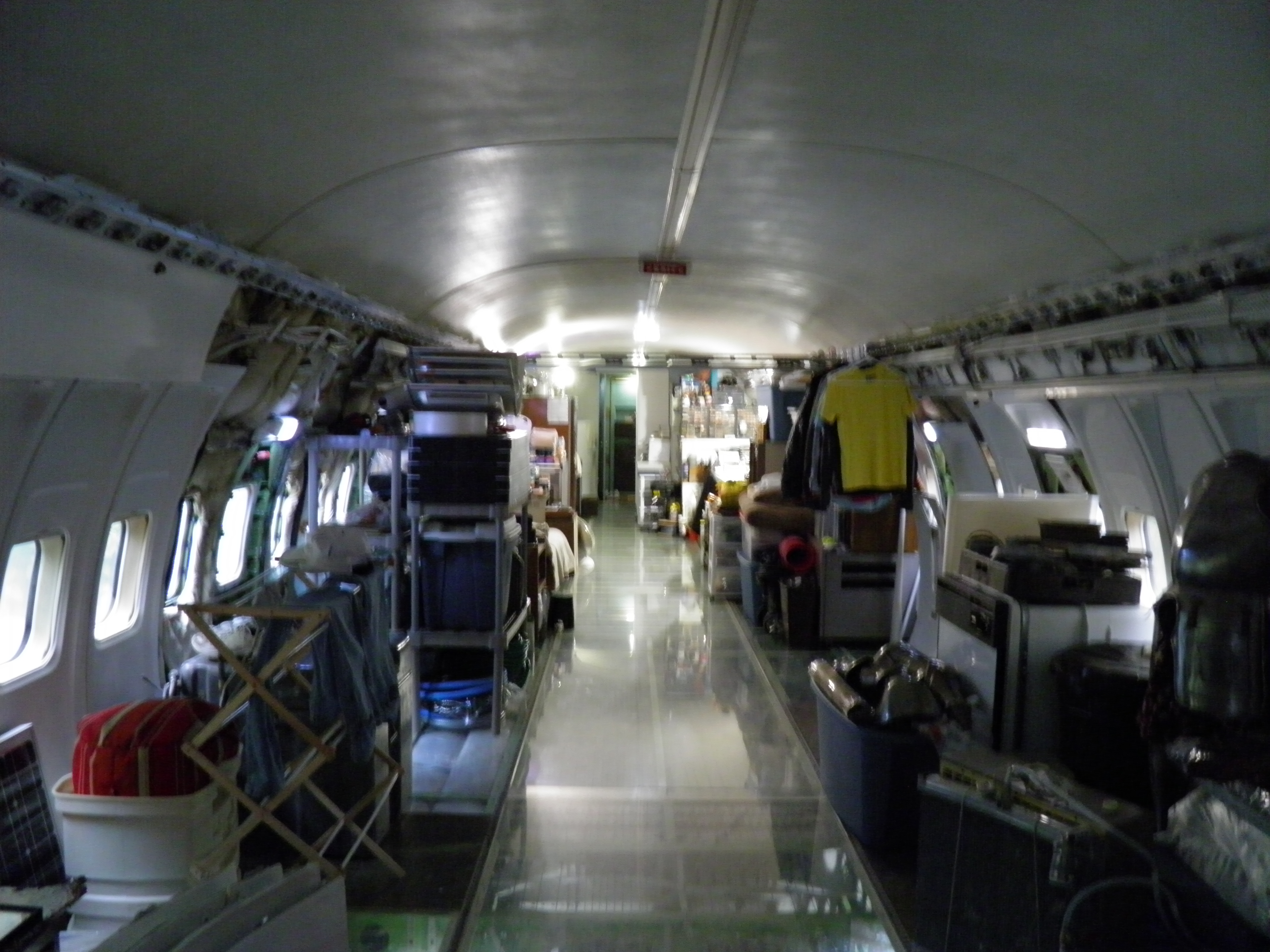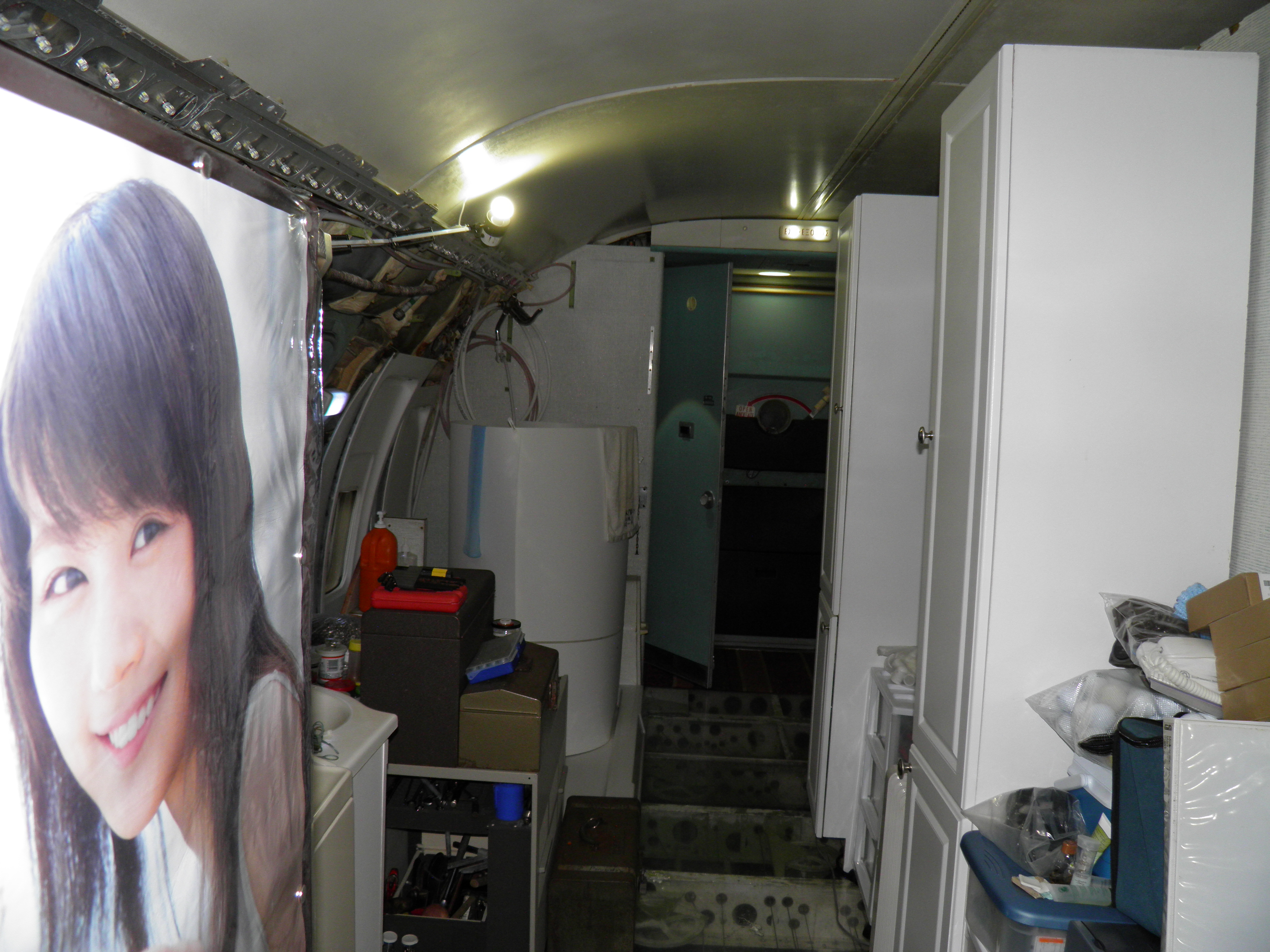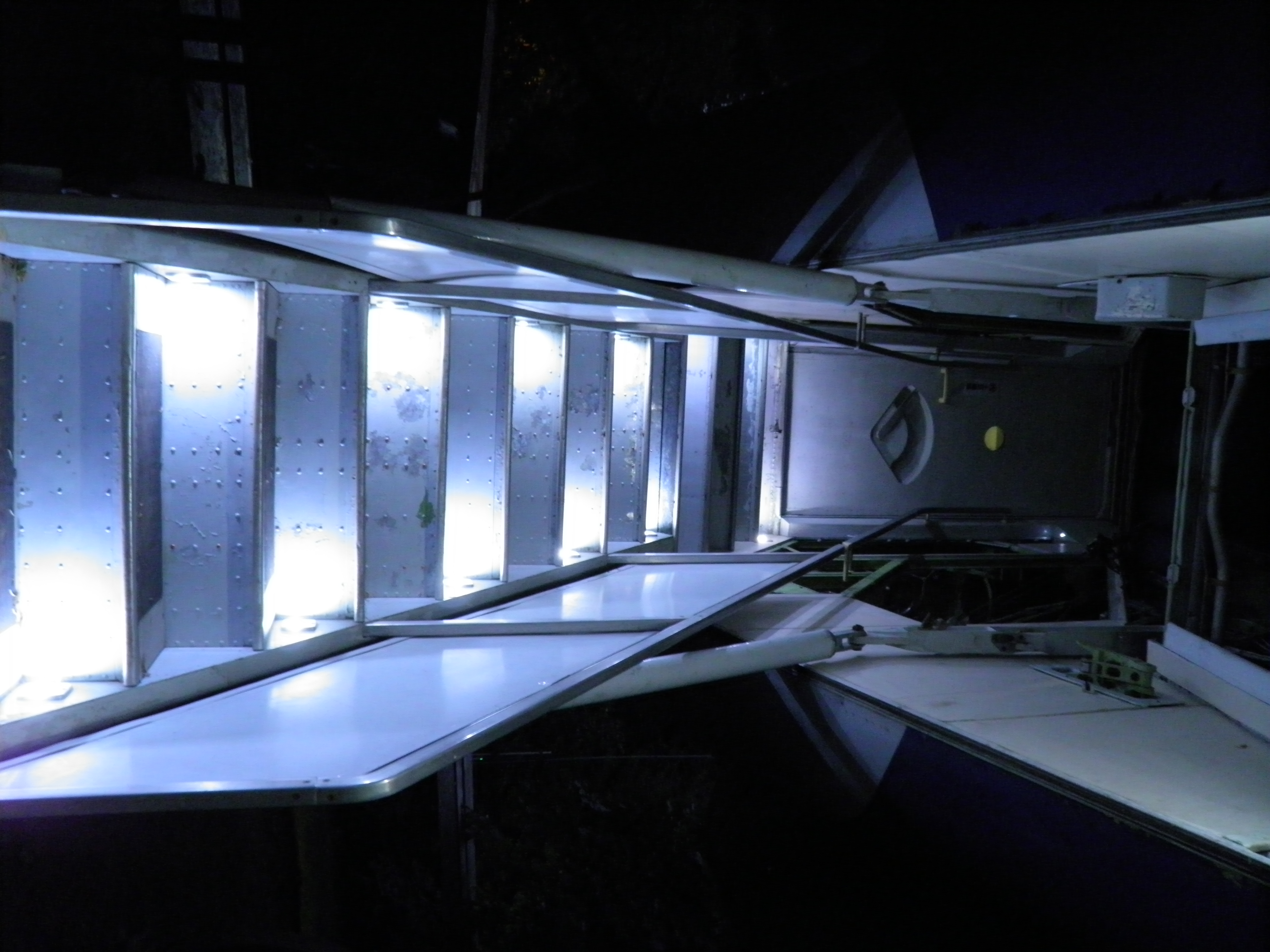 Numerous additional cabin window panels have been mounted, and some of the original cabin florescent light fixtures have been removed, and methods to cover their portion of the bare area underneath are being explored as you can see in a few of the images.  The same conversion will be performed for the rest of the cabin later.