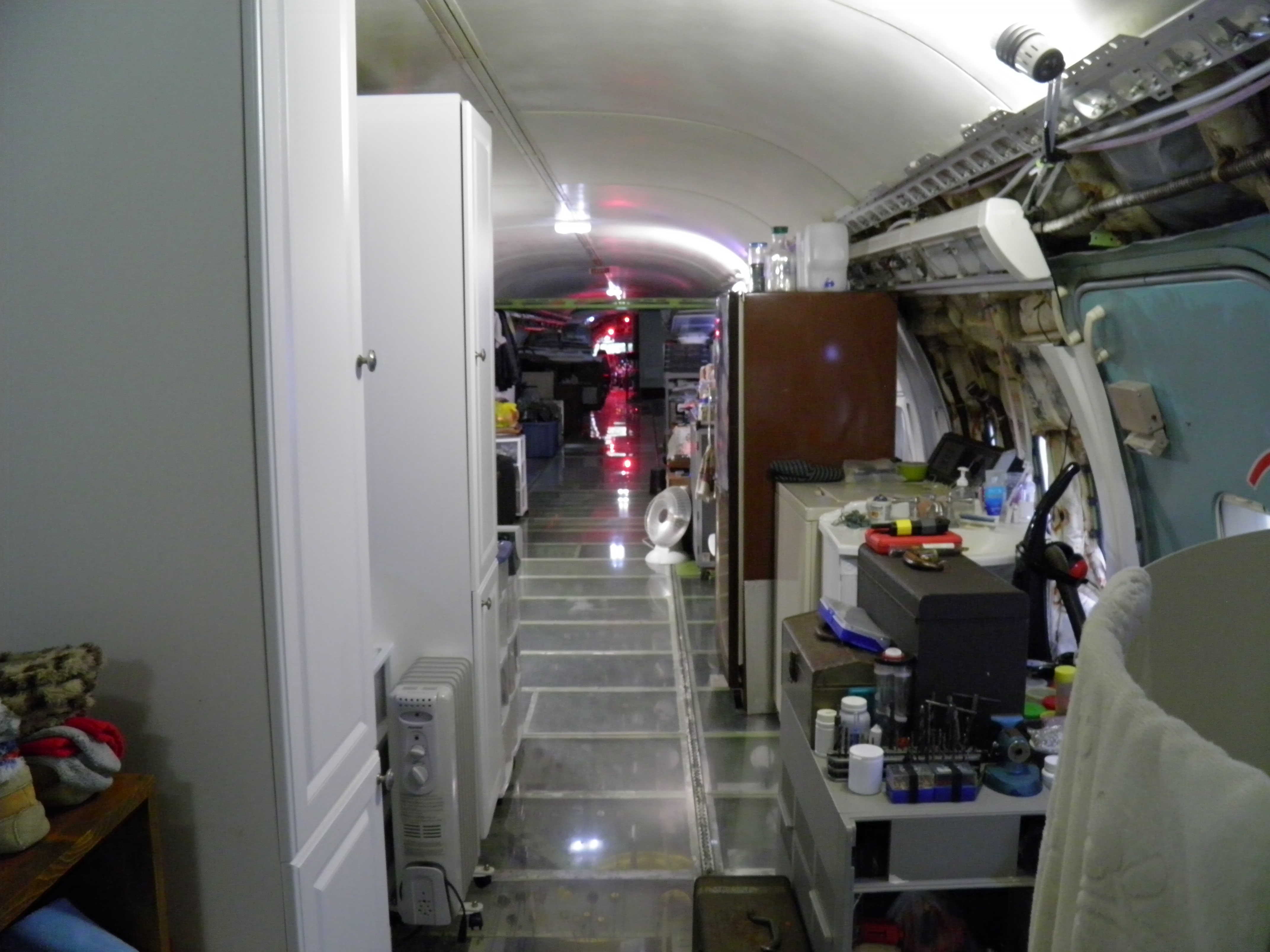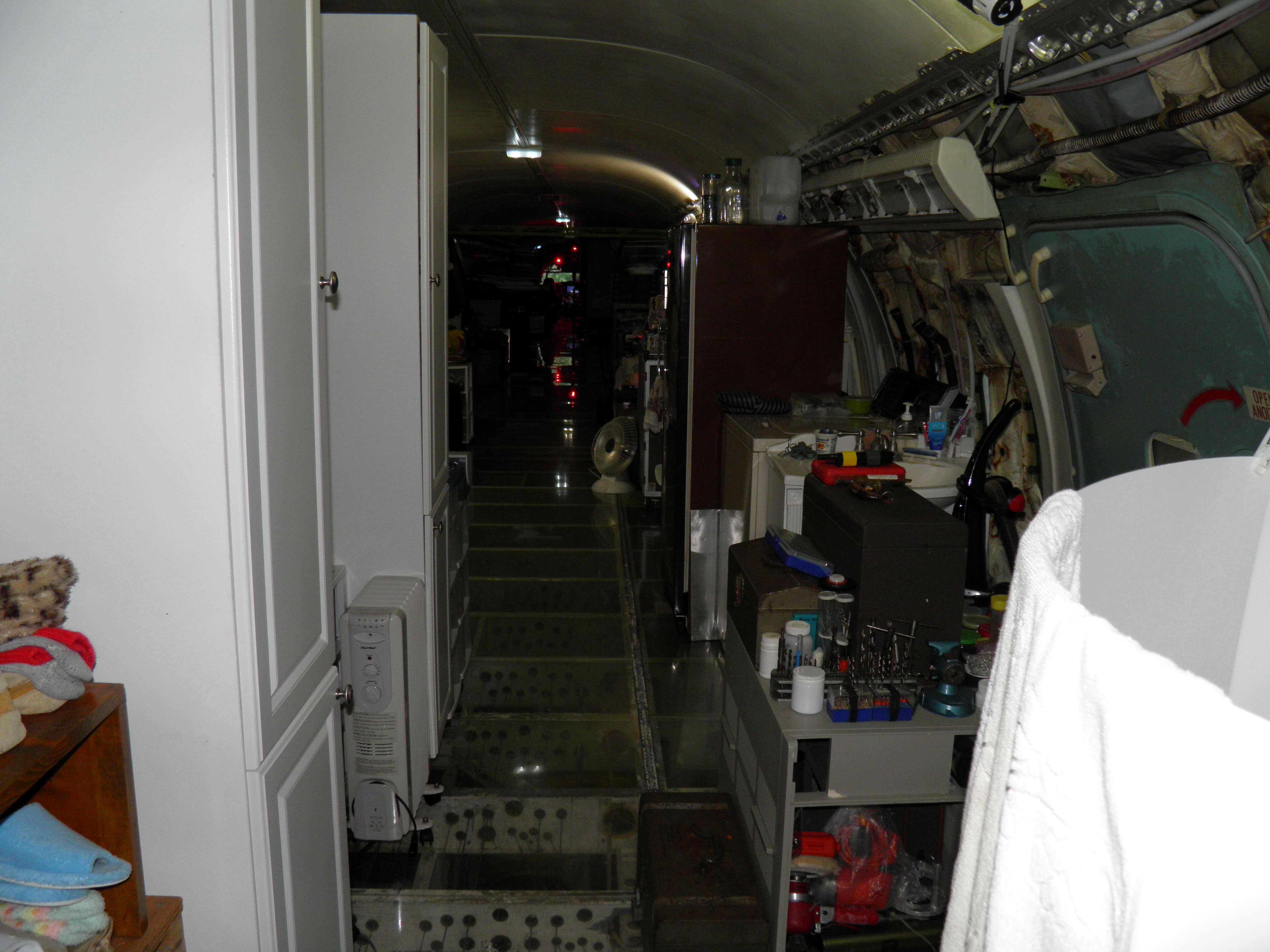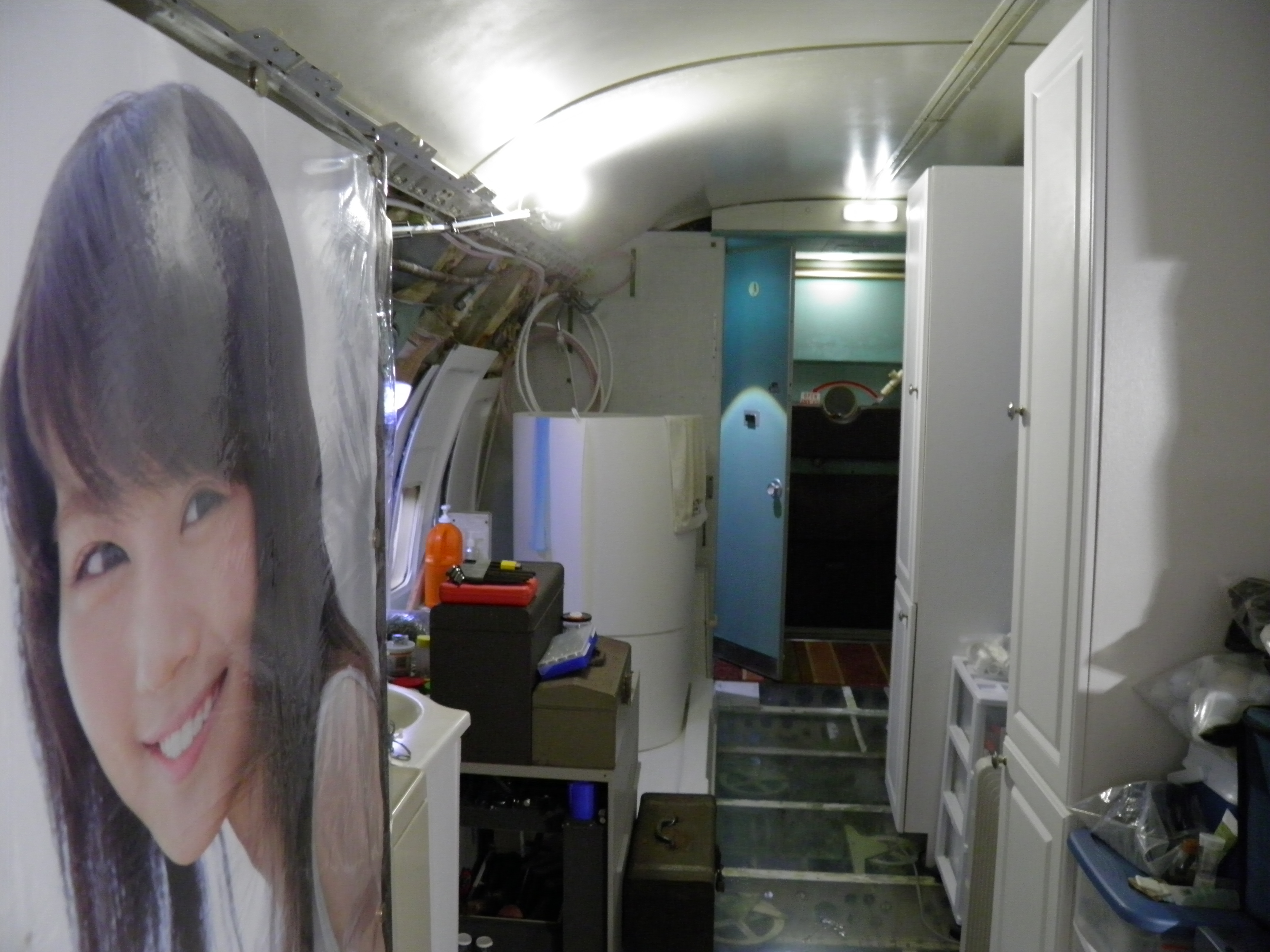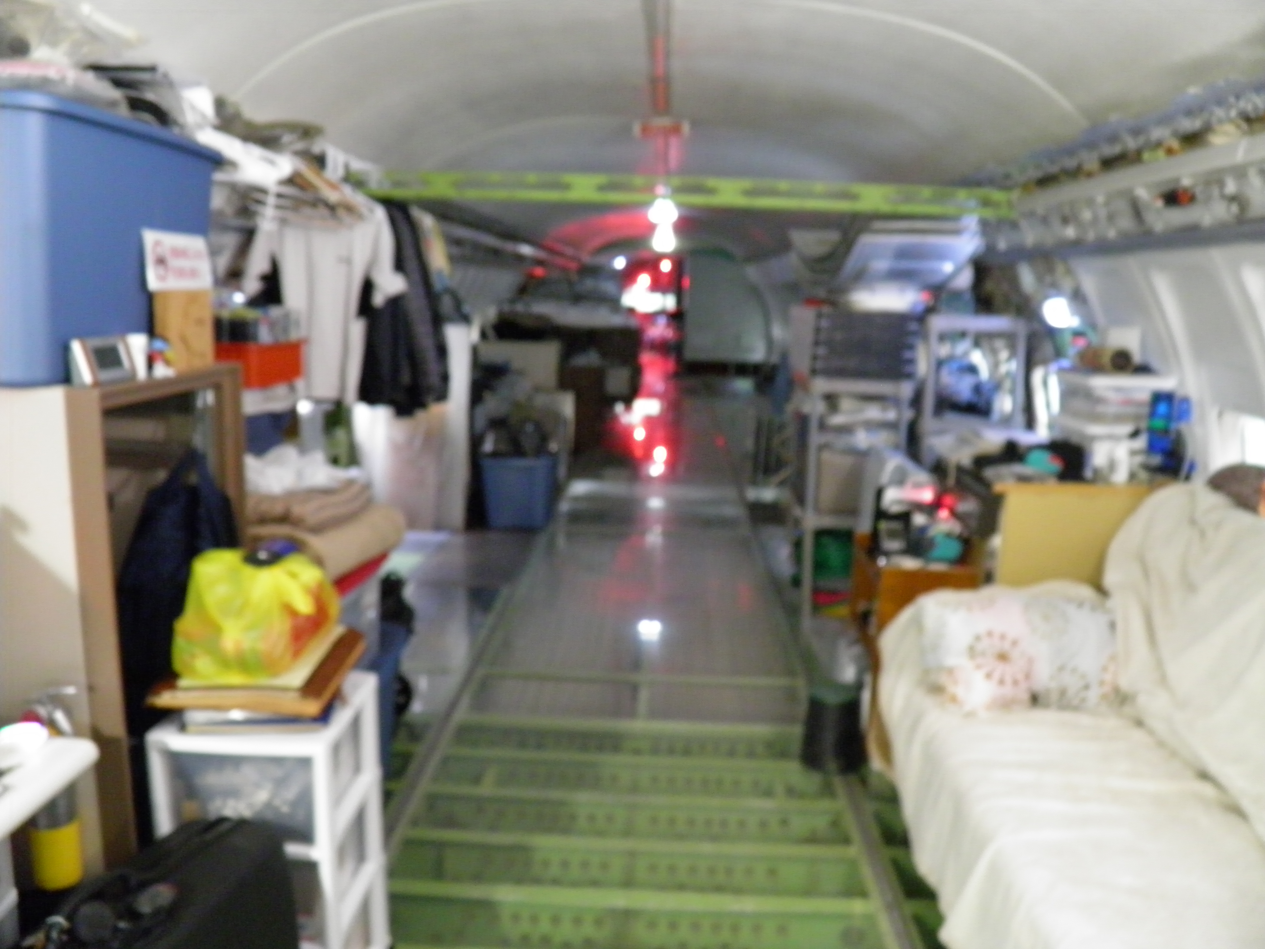 Numerous additional cabin window panels have been mounted, and some of the original cabin florescent light fixtures have been removed, and methods to cover their portion of the bare area underneath are being explored as you can see in a few of the images.  The same conversion will be performed for the rest of the cabin later.