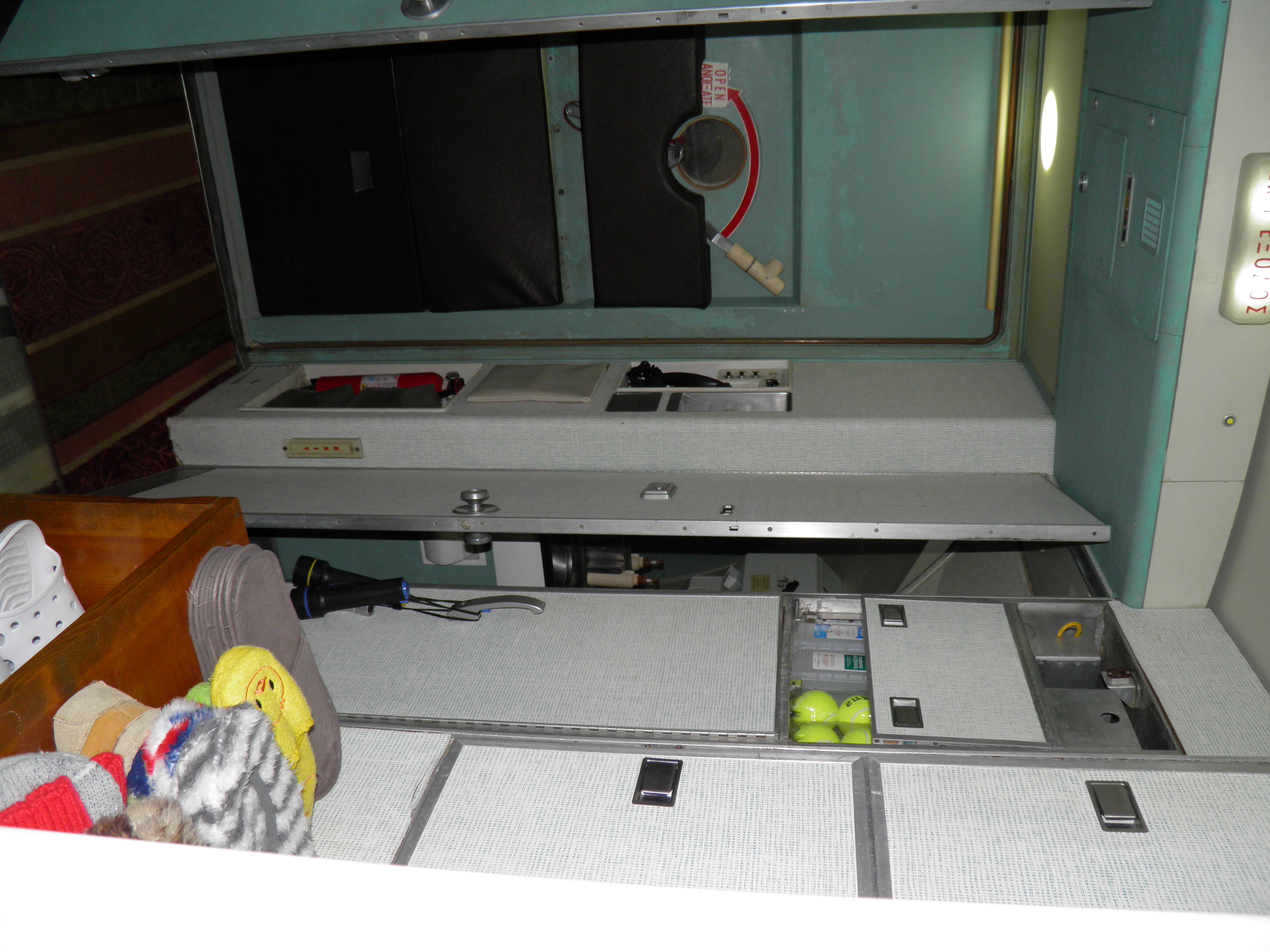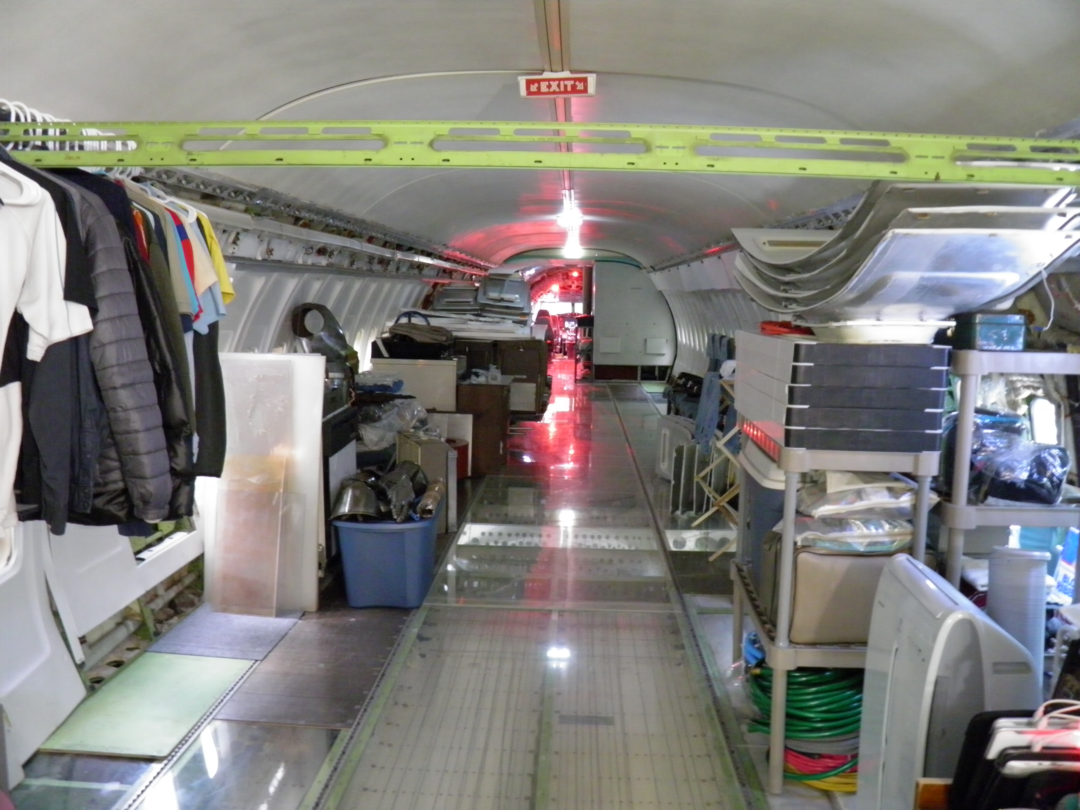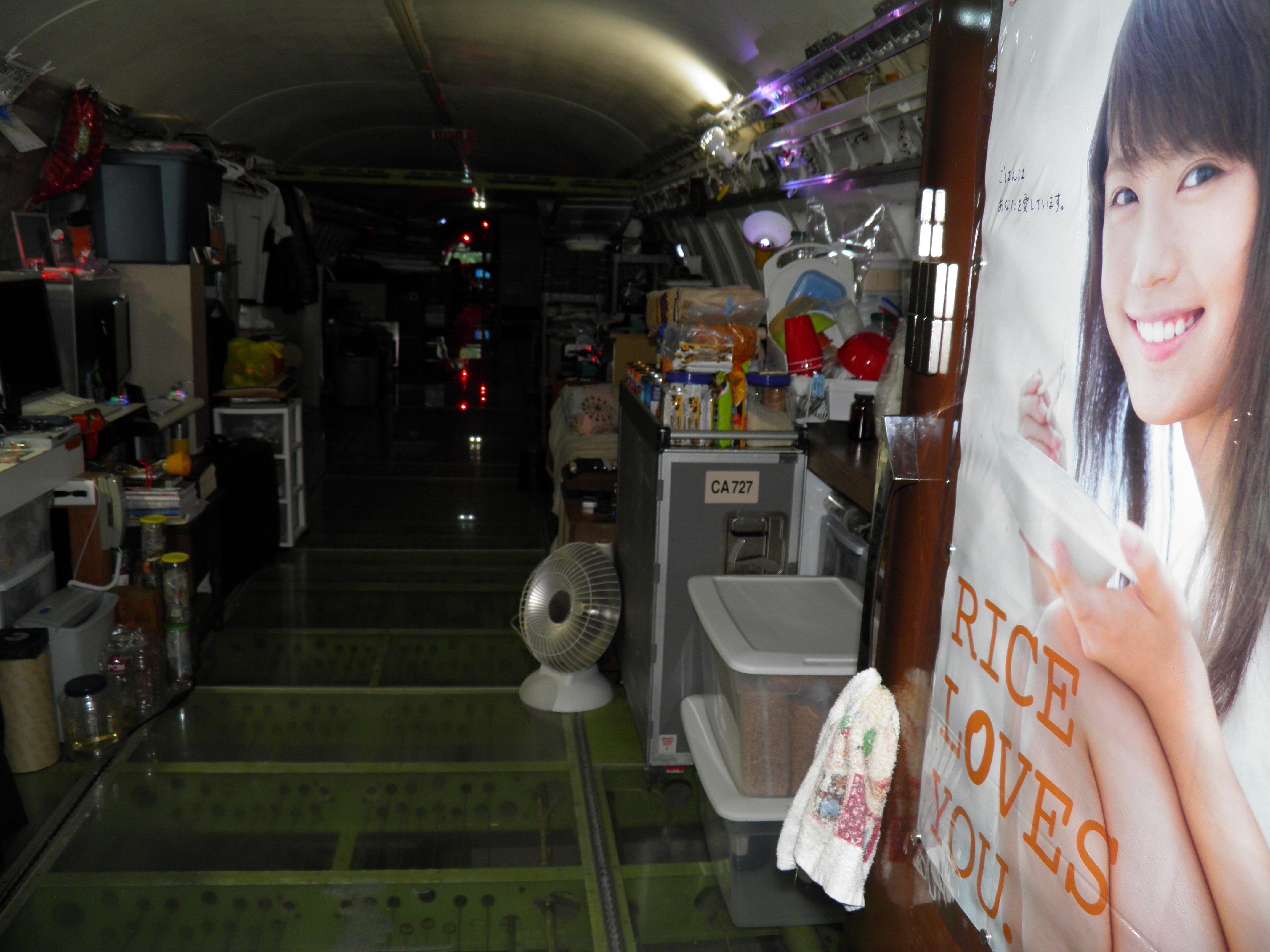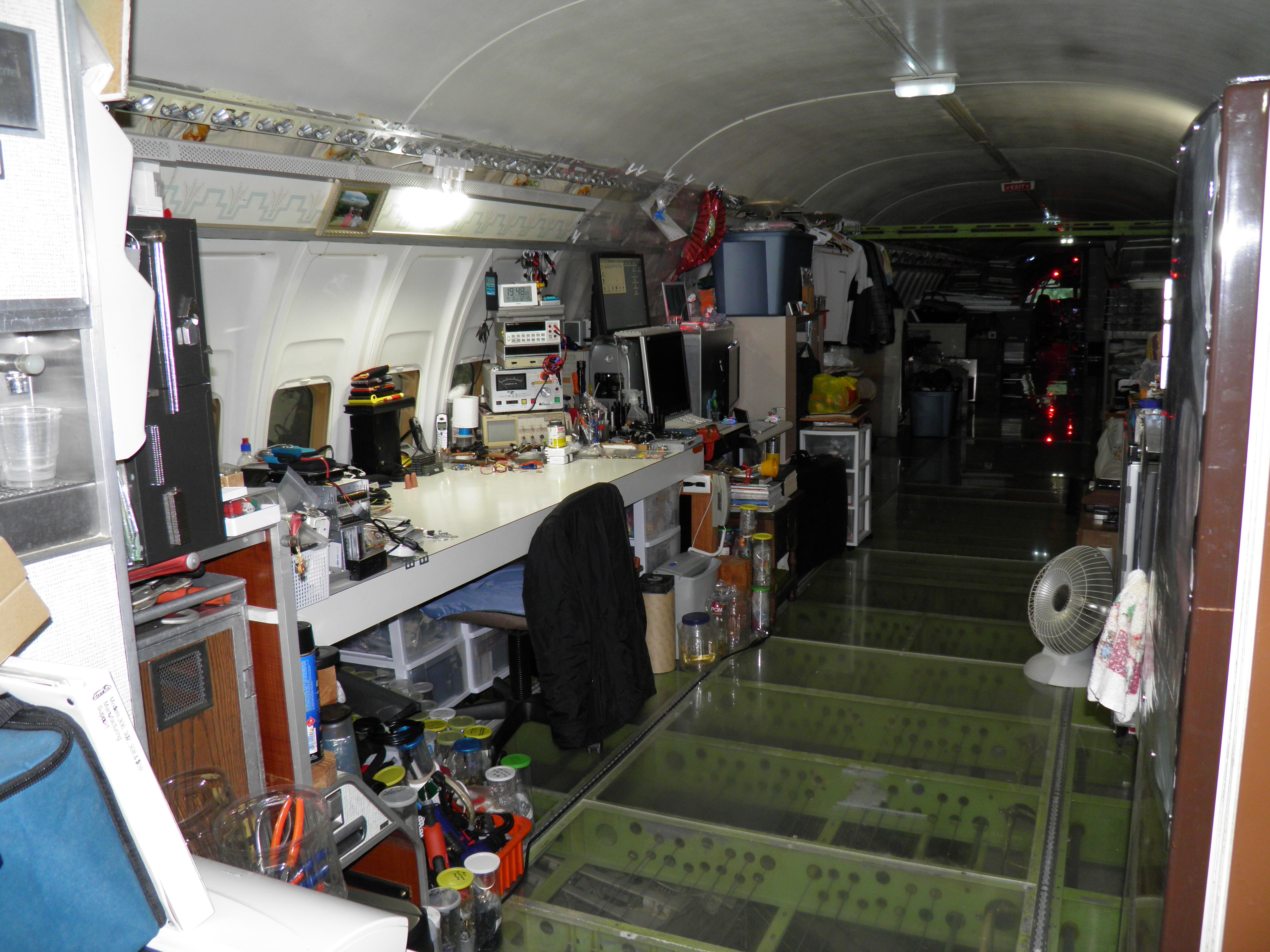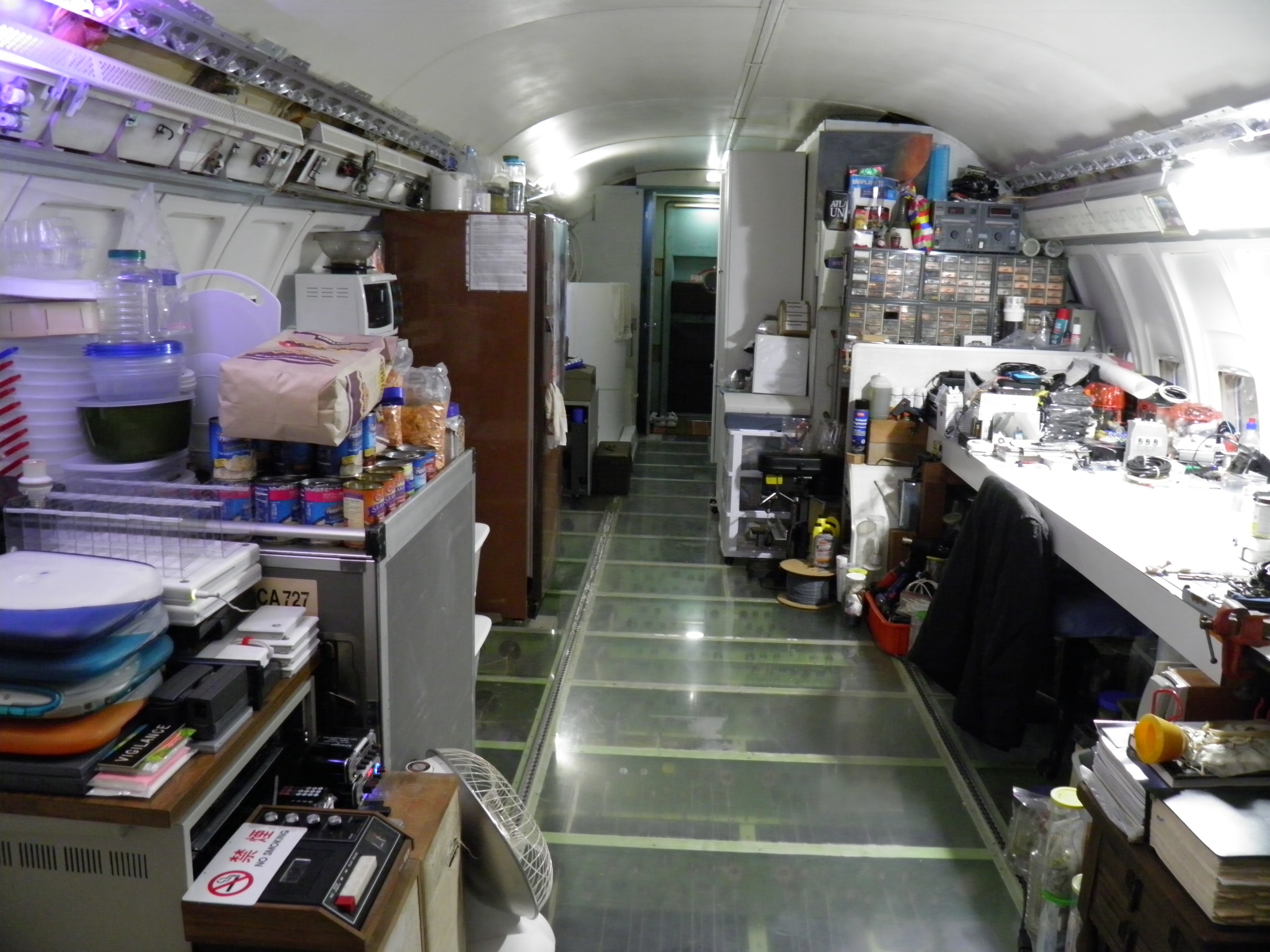Some new cabin de-cluttering work was accomplished - numerous old personal belongings were discarded and some 727 components were moved to the aft cargo bay, which is now over-packed with material.