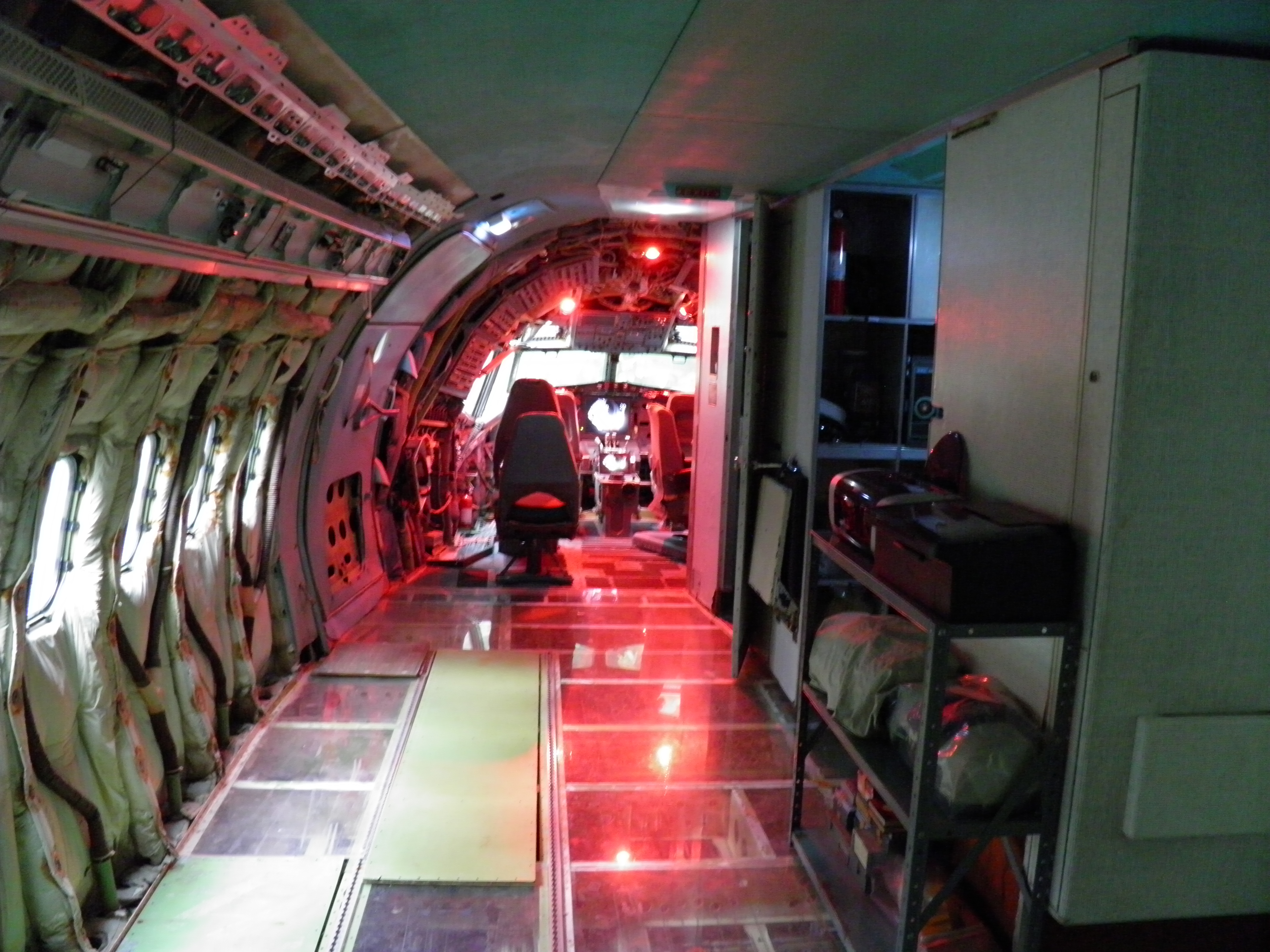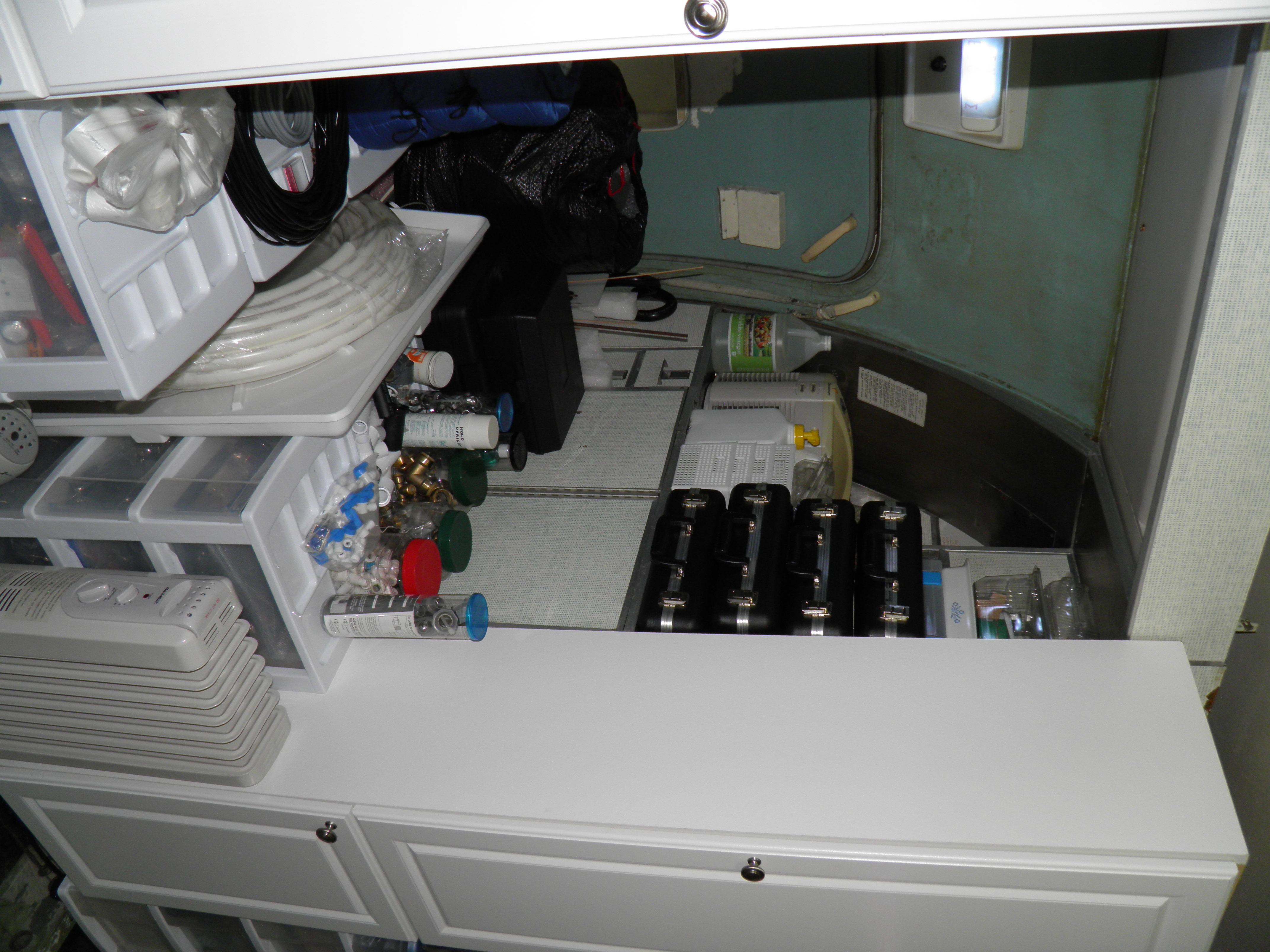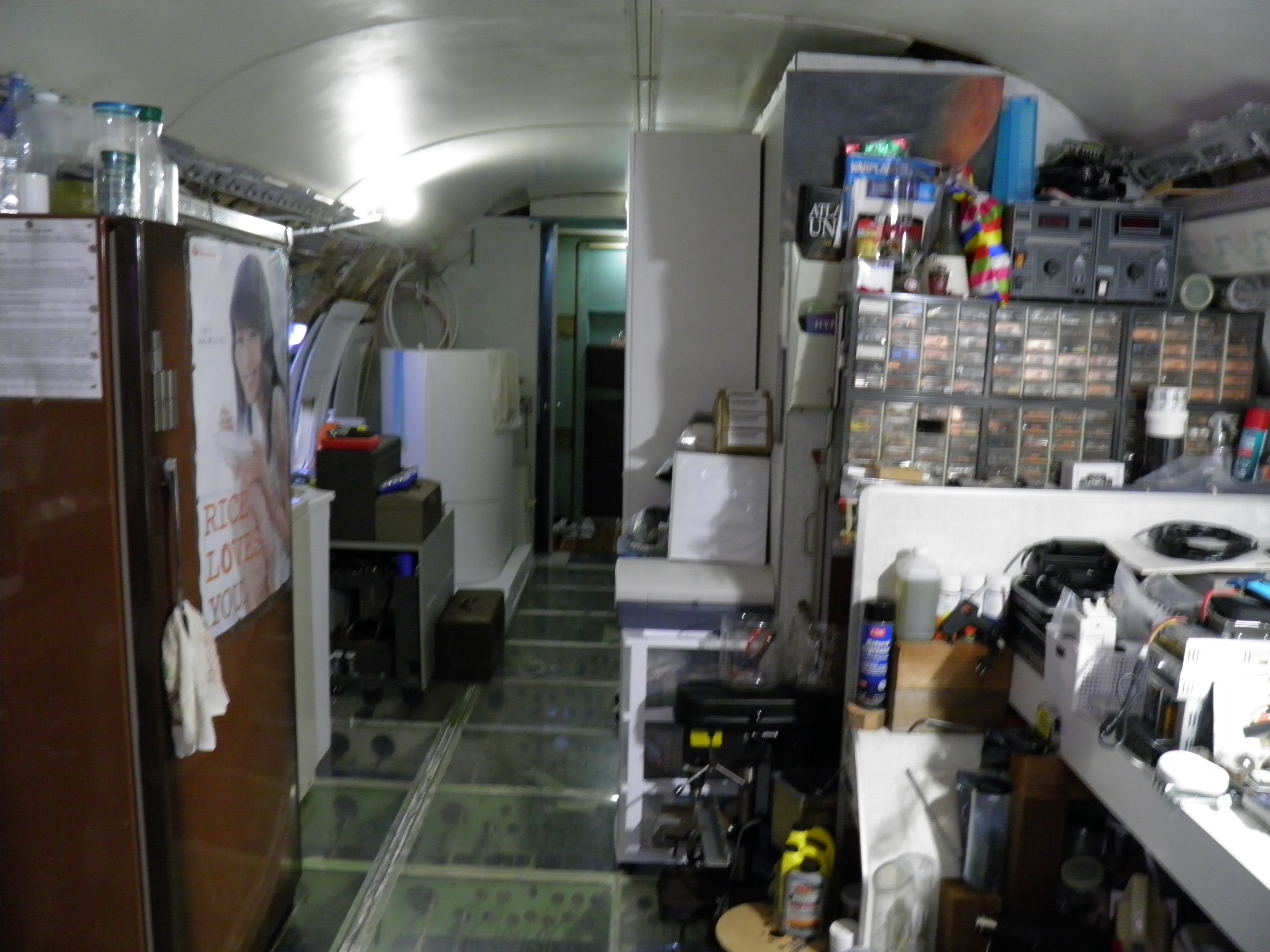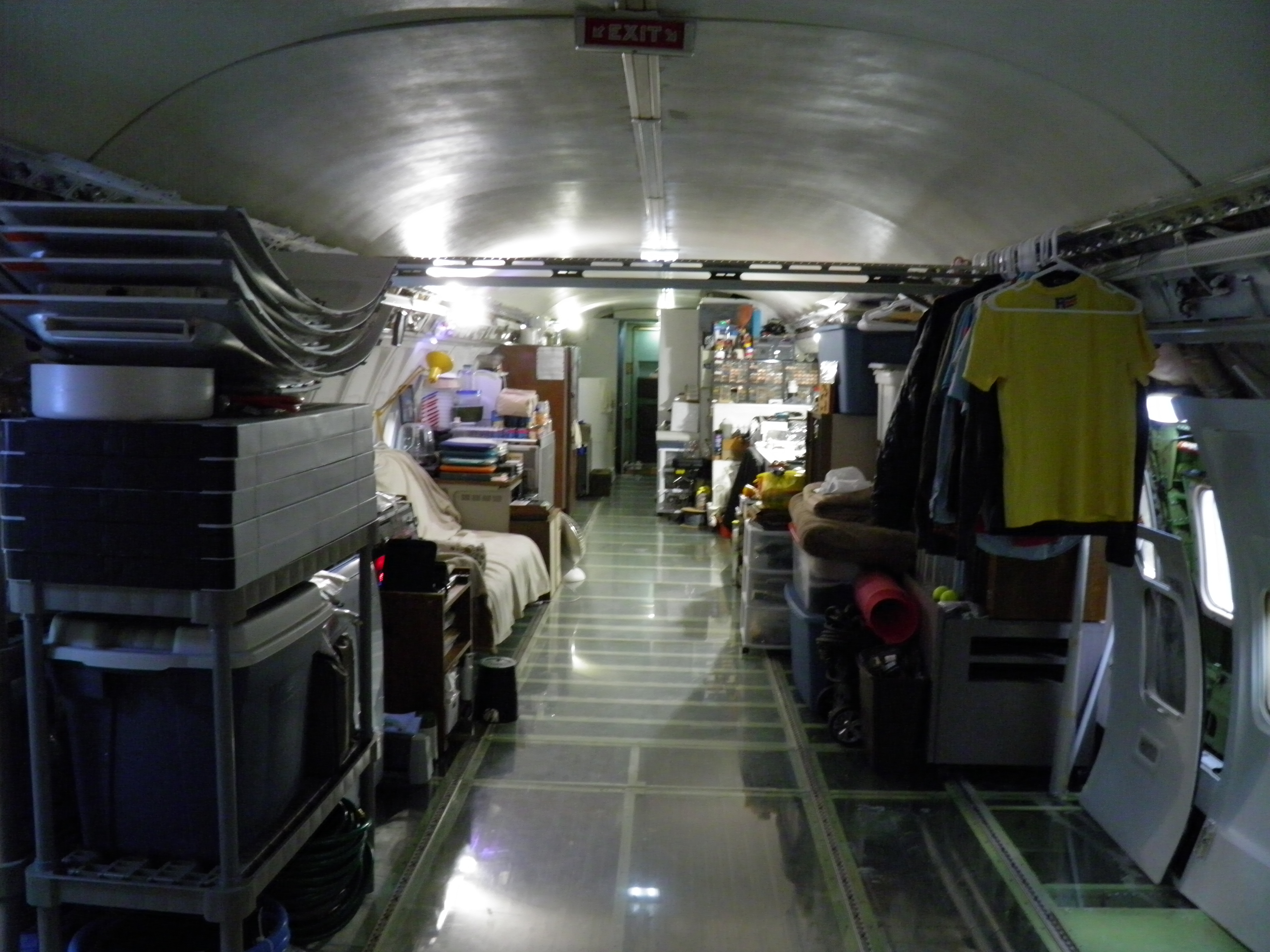 Some new cabin de-cluttering work was accomplished - numerous old personal belongings were discarded and some 727 components were moved to the aft cargo bay, which is now over-packed with material.