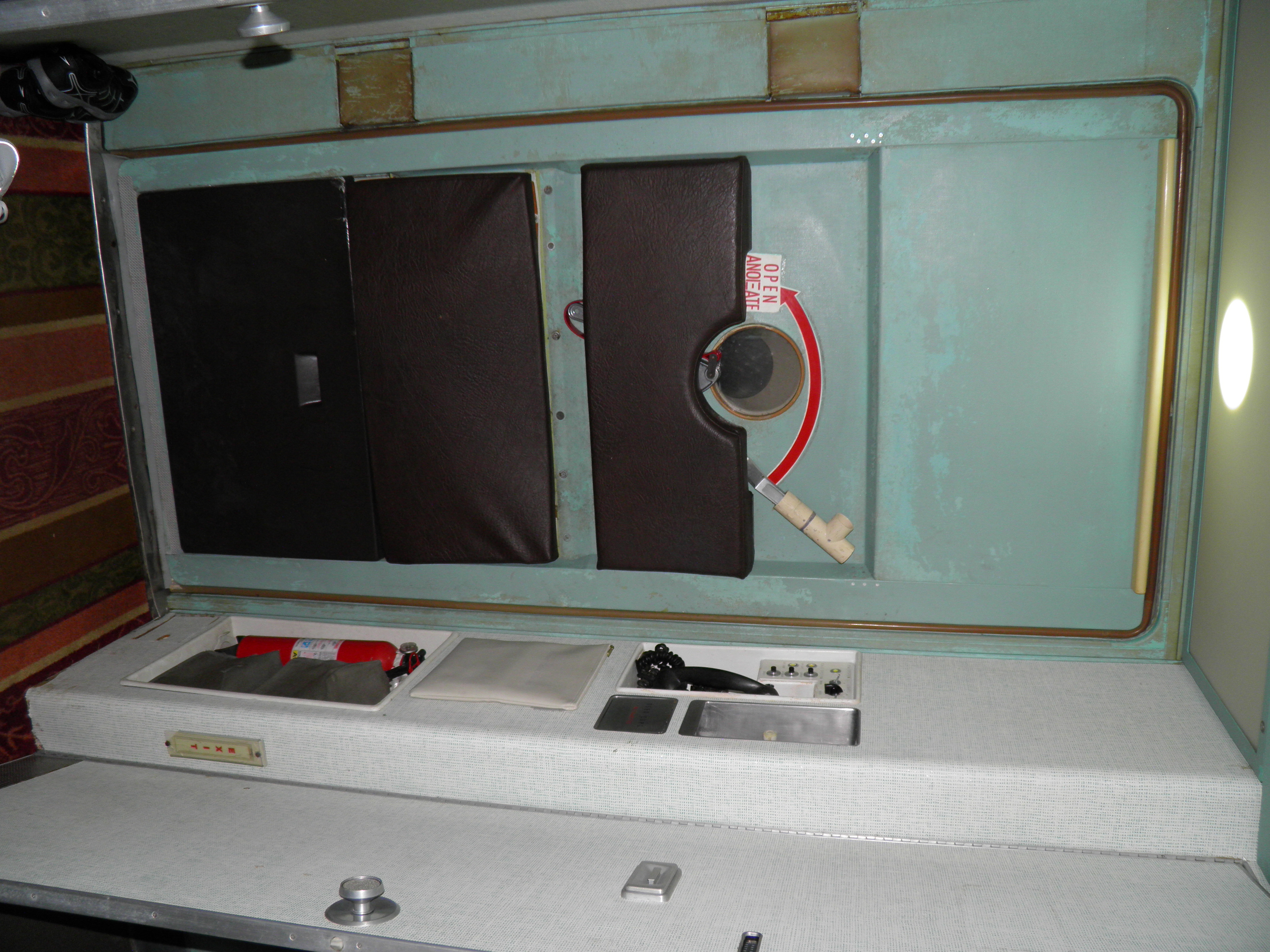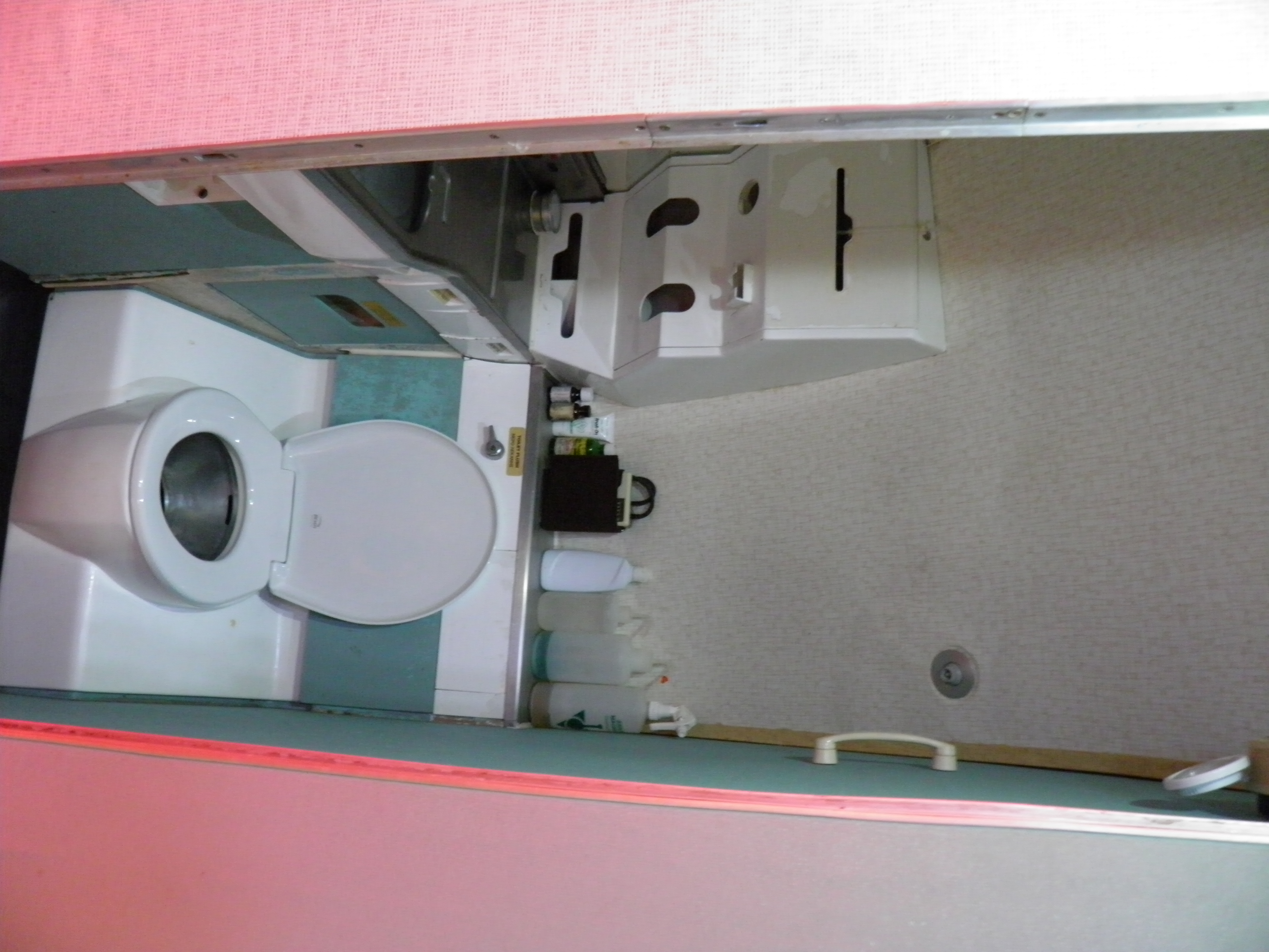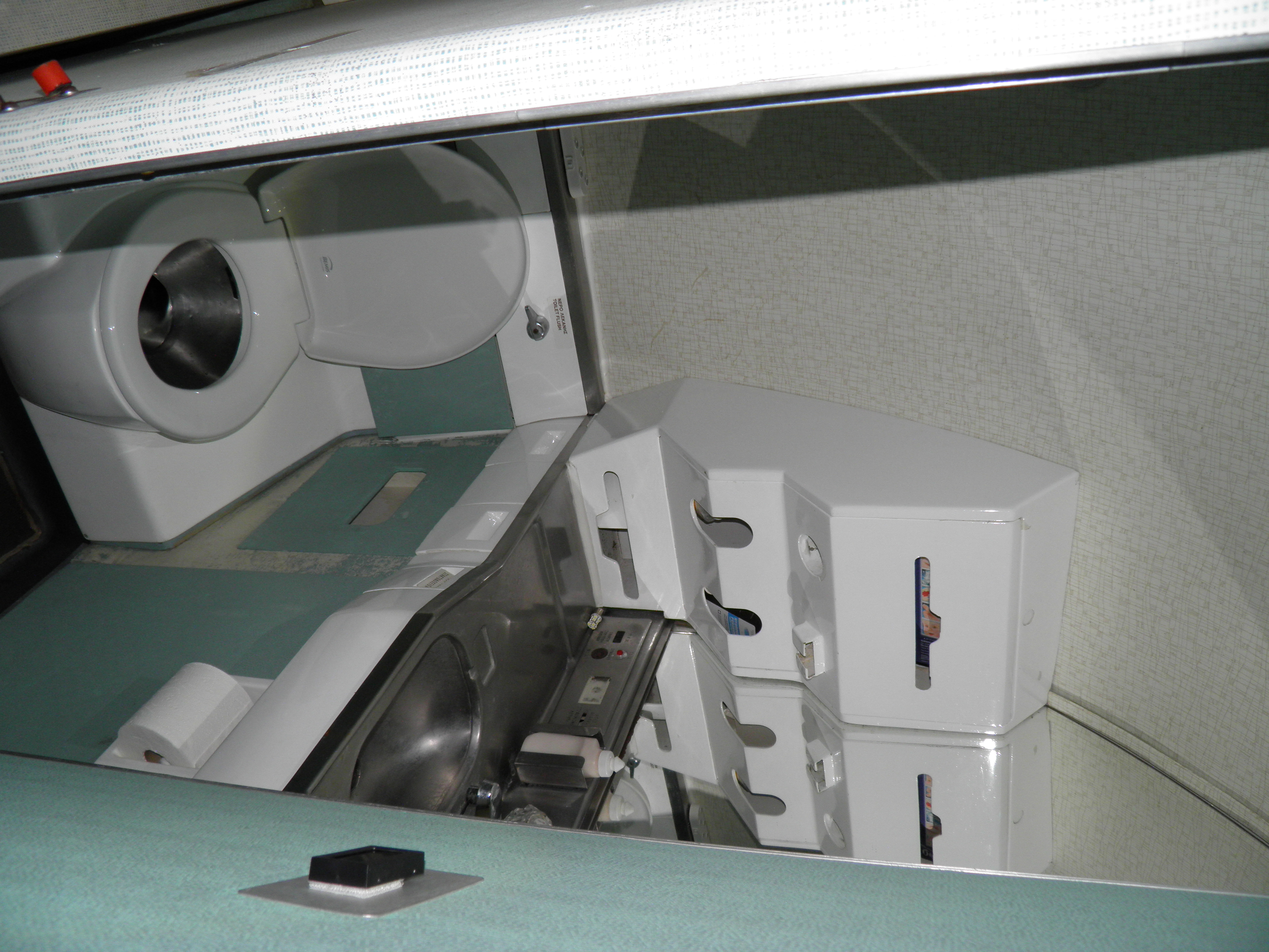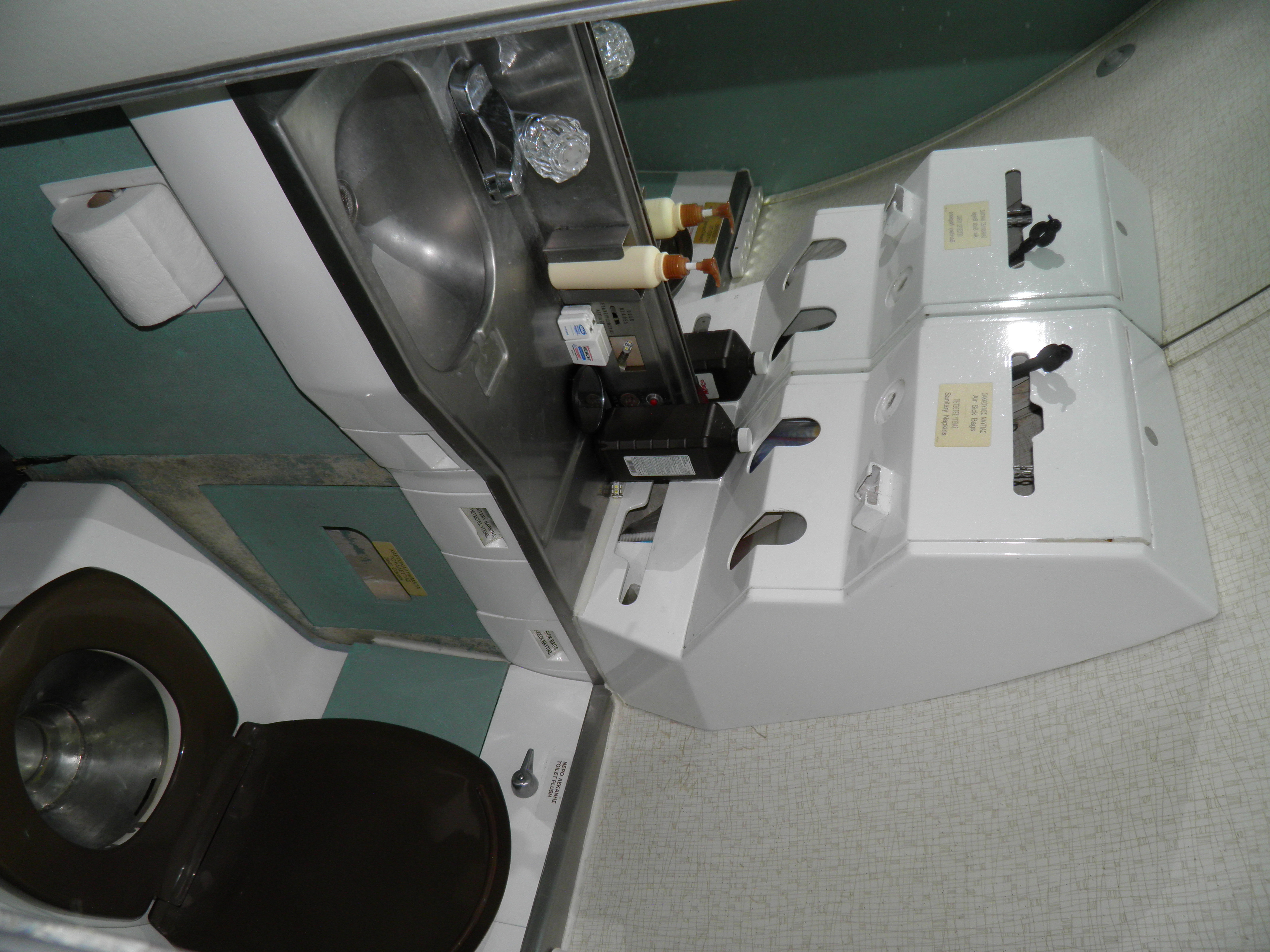 Both aft lavatory toilets are now fully functional, but hot water still needs to be connected to the wash basins (cold is connected), a light fixture in the right aft lavatory repaired, and the mirror light fixtures in both aft lavatories need to be converted from florescent to LED based illumination.  Some wall or door panel structures and their color treatment need to be repaired or refined as well.