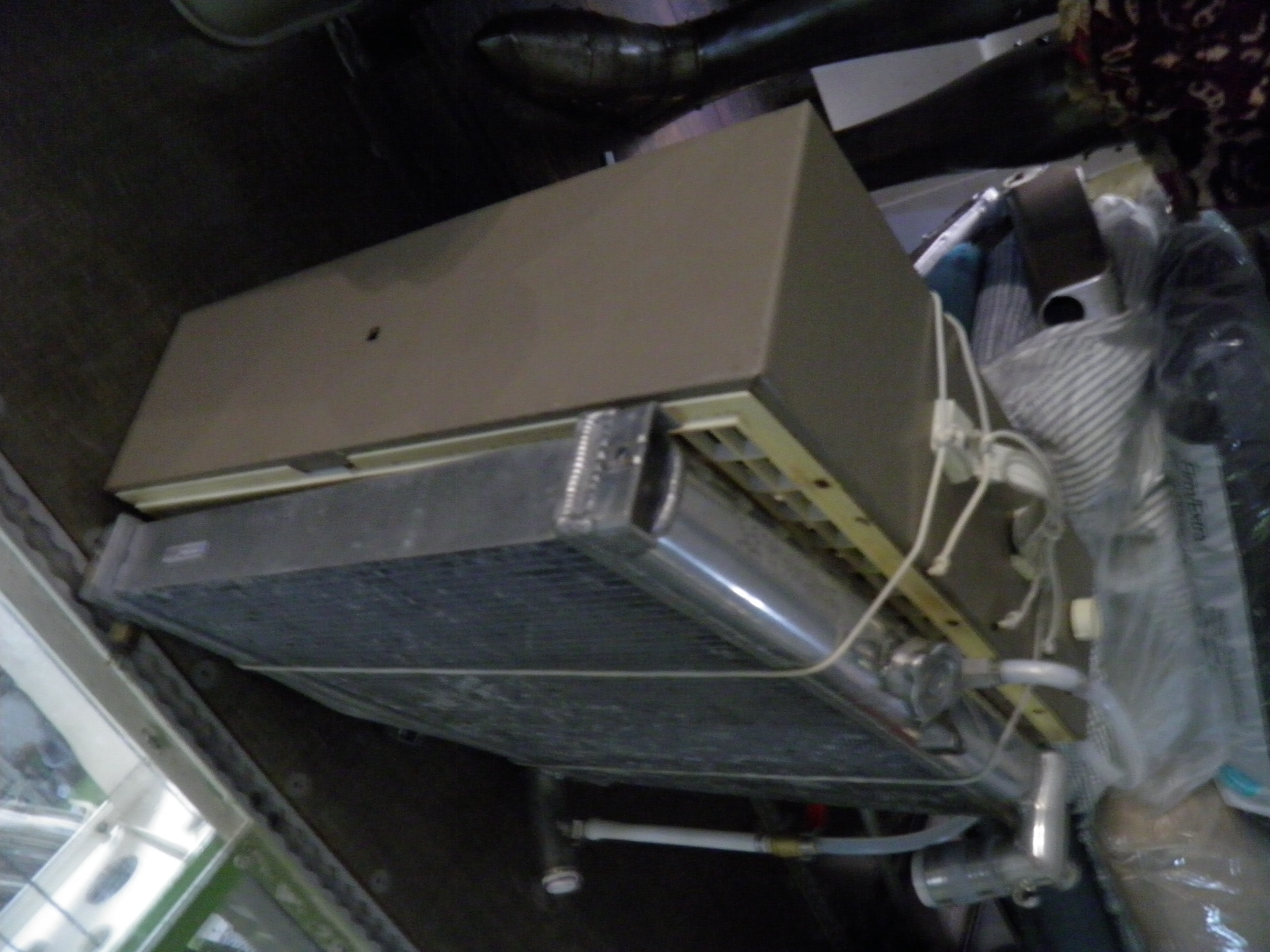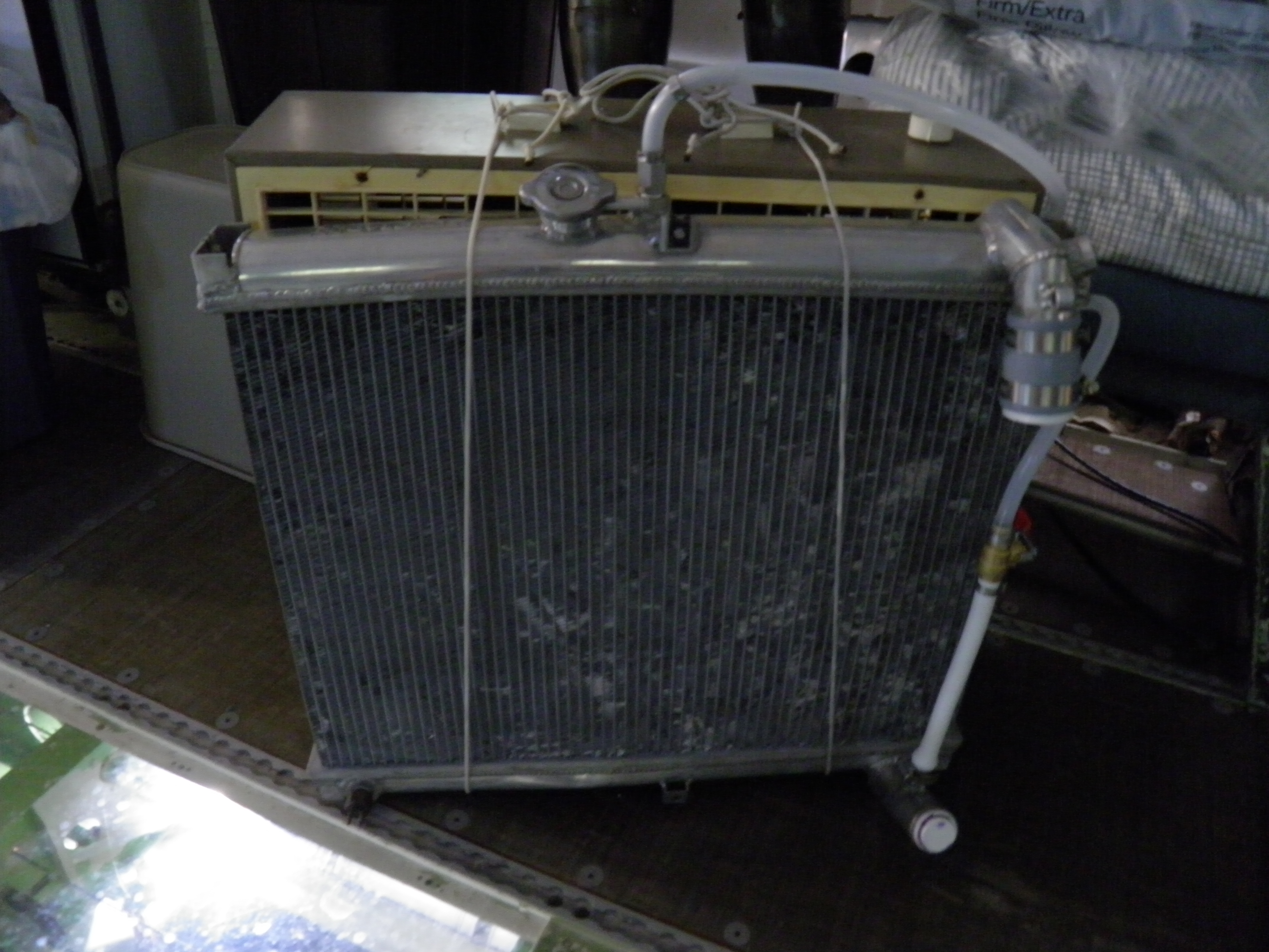 Returning to interior work, the initial working model of a well water based climate control system was built and is crudely operational.  My well water is always 13 ¡C irrespective of the season or weather.  So it provides a very economical medium to sink or source heat.  In the current assembly the well water circulates through an old Mazda RX-7 aluminum radiator with a box fan simply strapped to its aft side.  Upon exit the water is simply dumped overboard (currently simply through a condensation drain valve, but later through a drain mast).  The system cools or heats the cabin air toward the 13 ¡C temperature of the well water.  Obviously during cold weather an adjunct heat pump or other ancillary heating will be required.  But during hot weather no additional cooling equipment will be required if the well water based system provides sufficient capacity.