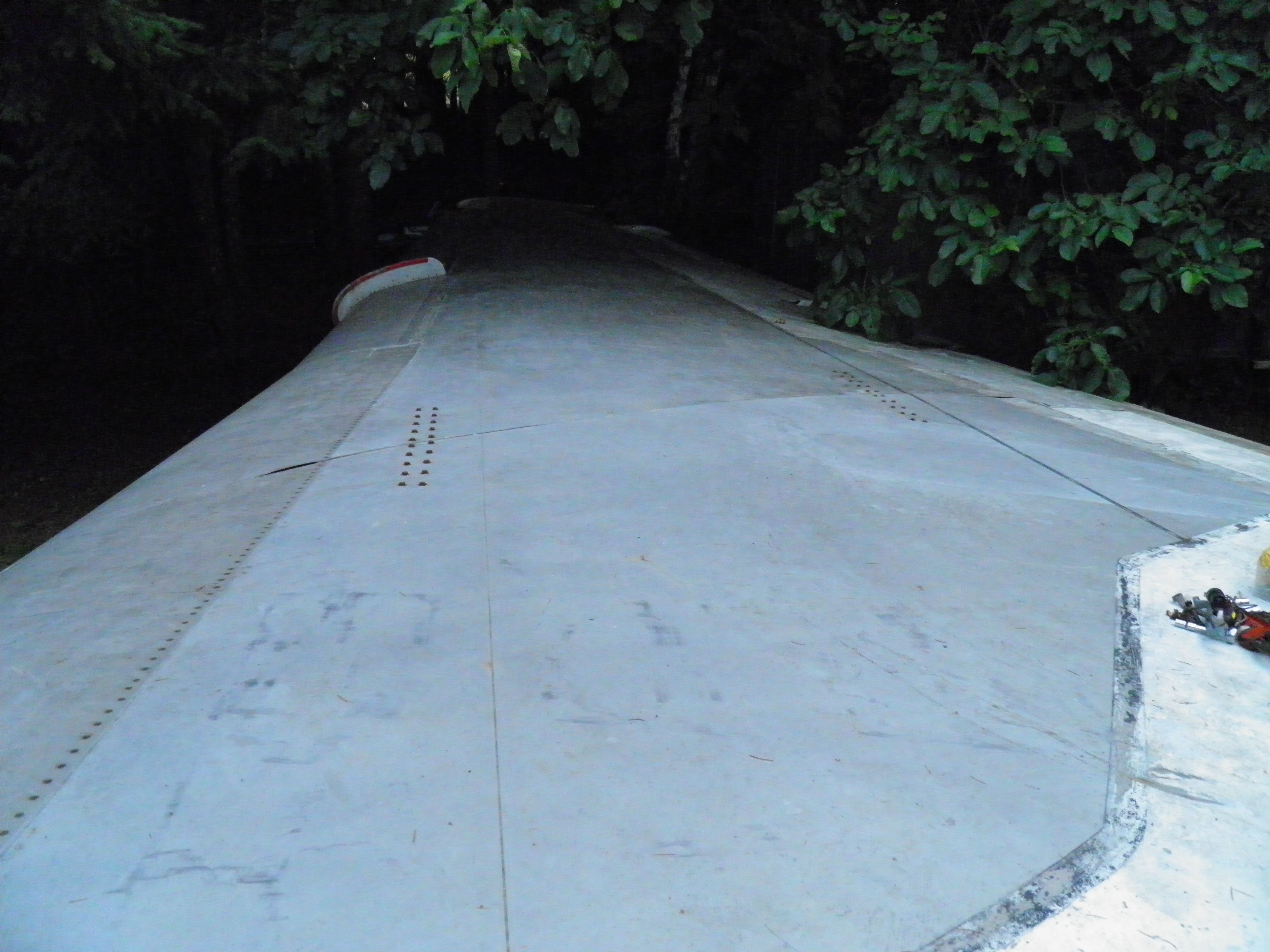 The most attentive of you may have noticed from the images below or my text above that the right wing's inboard flaps have been mounted, no small achievement in my modest world.  Many thanks to good friends, including Mark, Jason, and Abigail without whom the task would have been impossible.  (Jason and Abigail, among the most charming, intelligent, and admirable of my many inspiring visitors, volunteered hard sweat labor in the course of their visit, providing both the brains and the brawn required to mount the very heavy outboard flap track for the right wing's inboard flaps.) This task isn't quite complete - a reassembly sequencing mistake necessitates extension of these flaps, some repositioning work, then a final retraction.  But that should be relatively easy - probably no more than a one day task.  In the meantime these flaps are mounted and mostly retracted, making the right wing's useable area larger, safer, and visually more appealing.  And of course the grounds behind the right wing, now free of the flap components, are safer and look more attractive too.