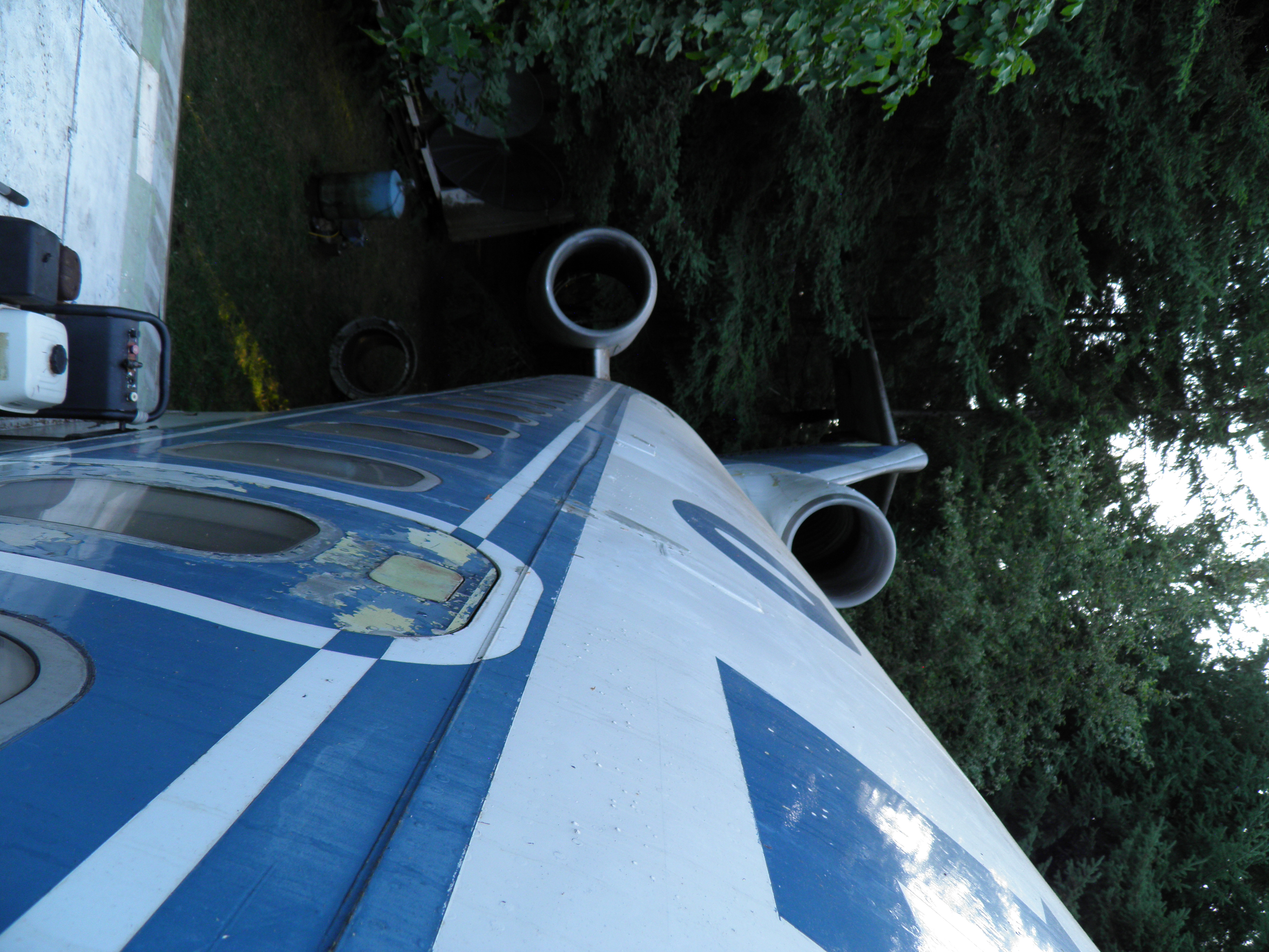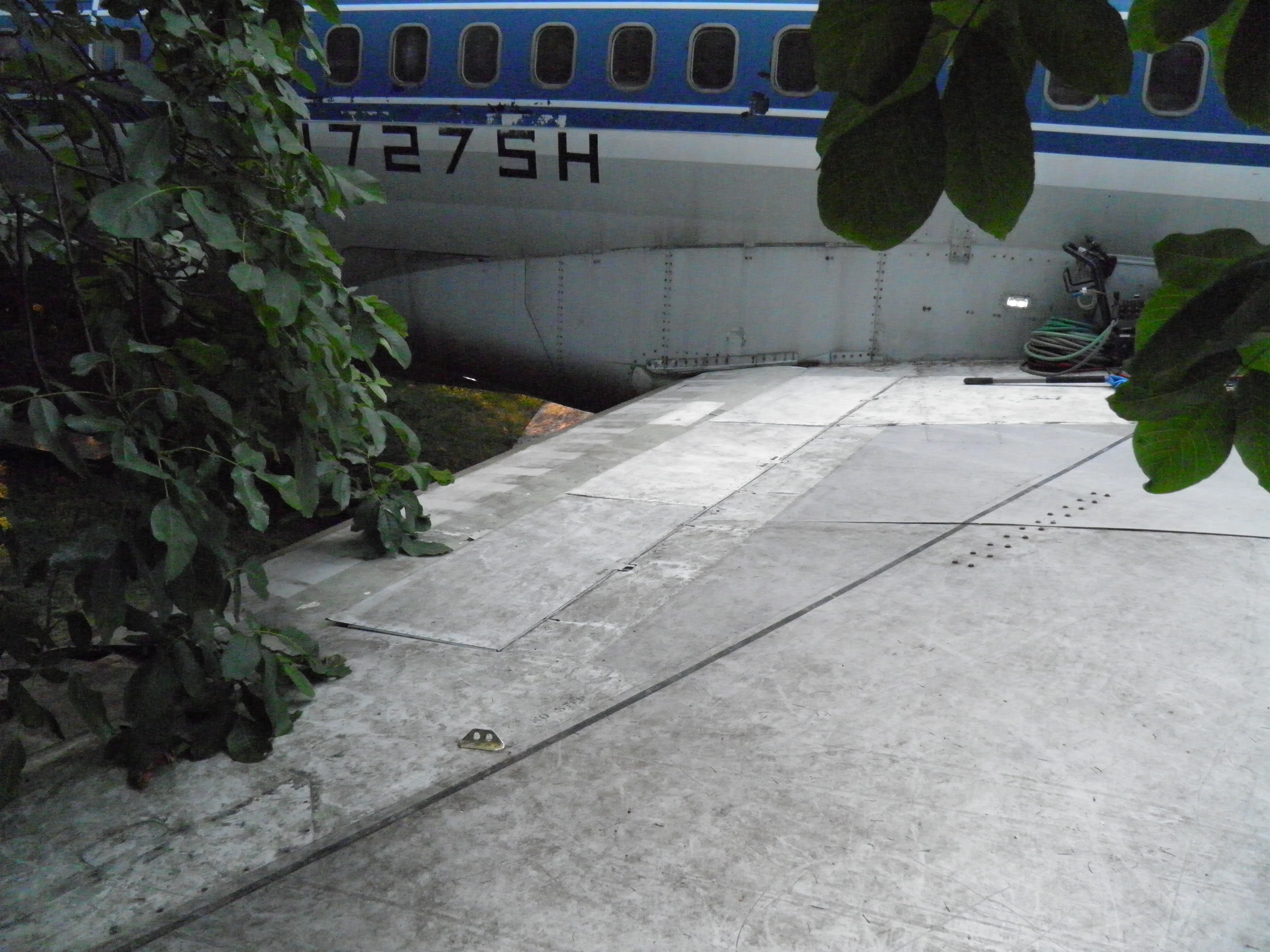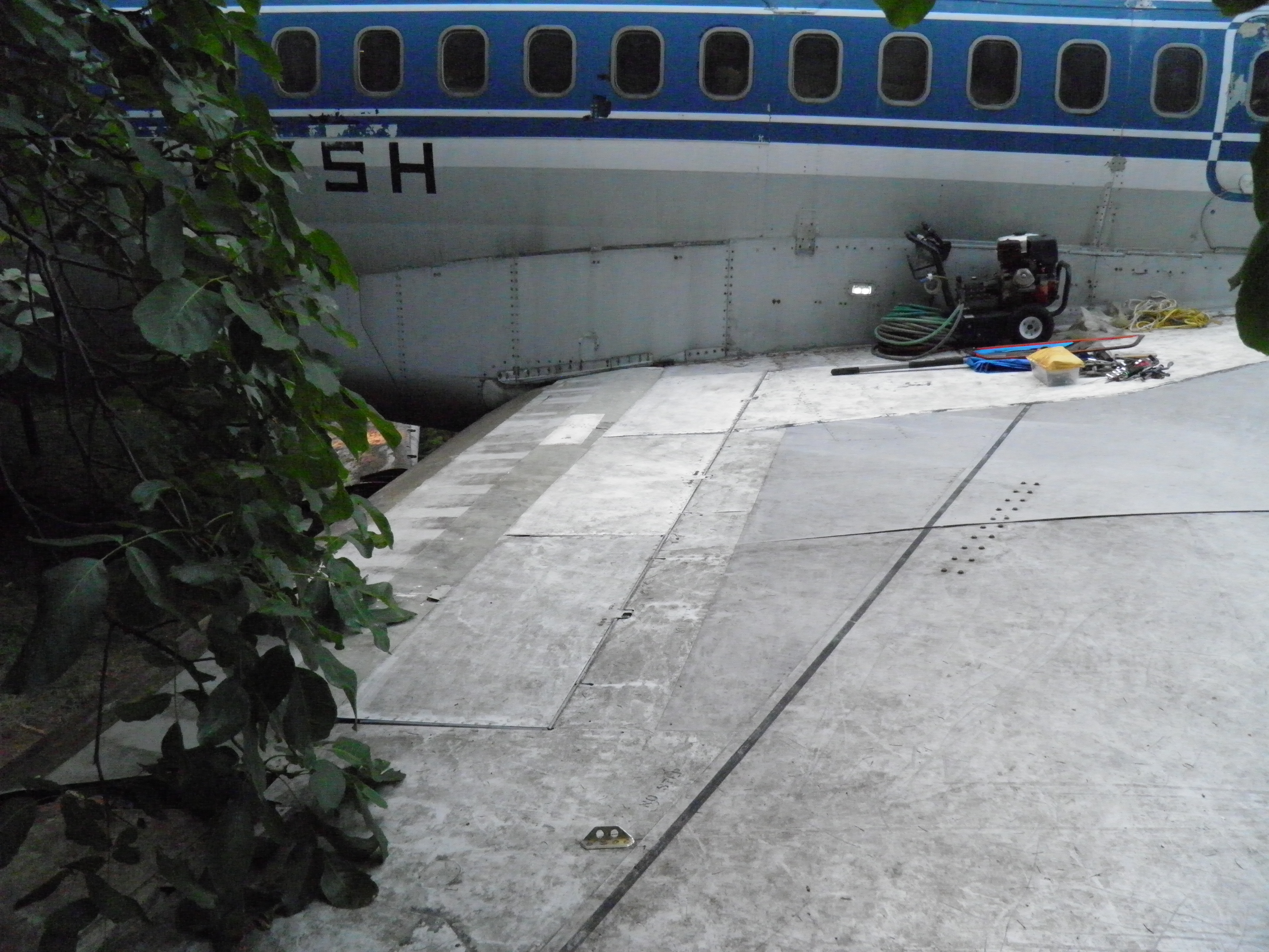 Exterior work included fabrication of a simple structure rendered from surplus computer room floor tiles which provides stair like access to the top of the right wing tip.  The same tiles were also used to fabricate a simple porch over the turf the air stairs rest upon when extended, plus an elongated landing surface for the aft drain mast which disperses the gray water which exits that mast so no soil erosion occurs.  In addition to functional benefits, these simple improvements significantly enhanced the visual appeal of the grounds.