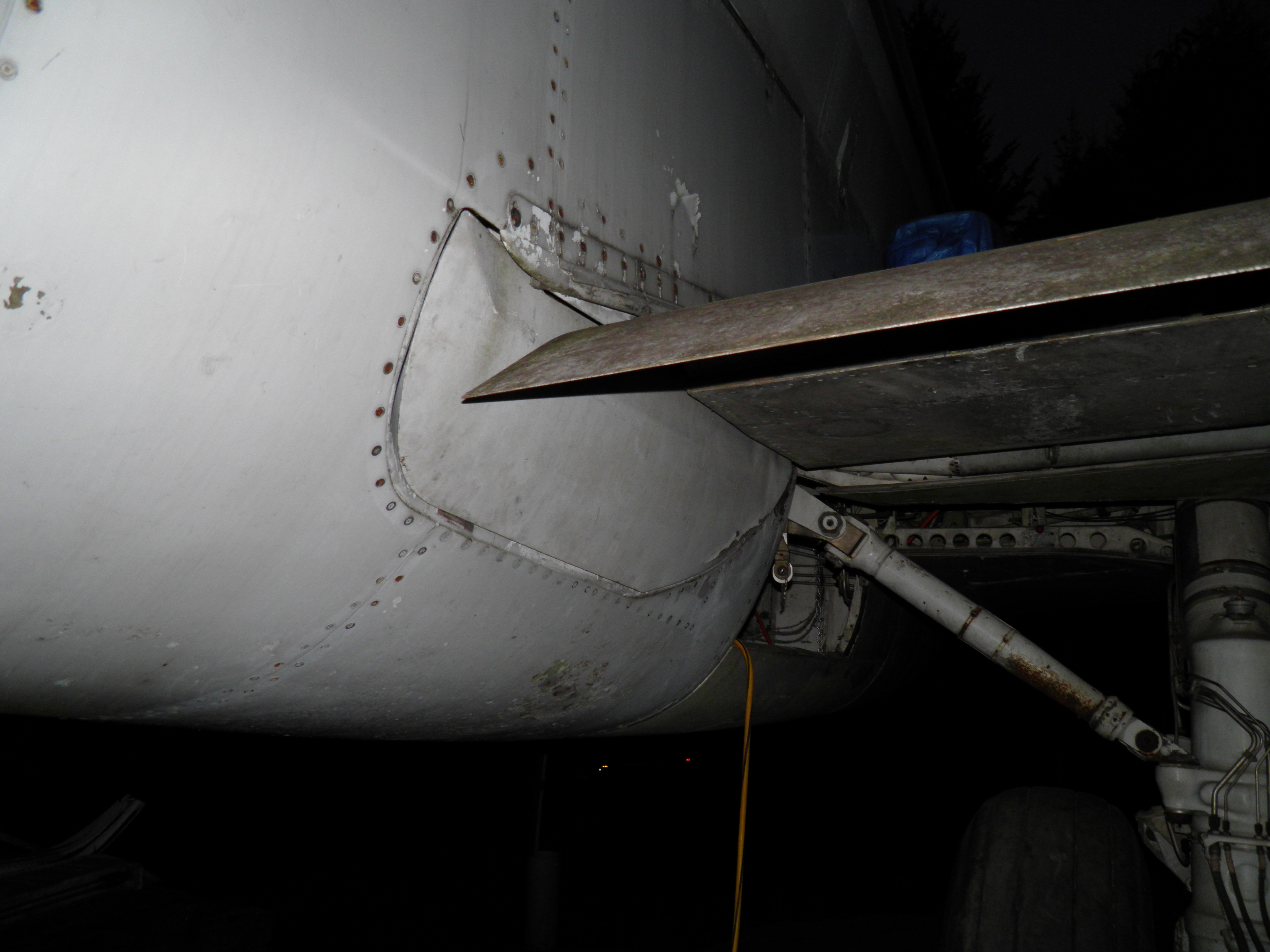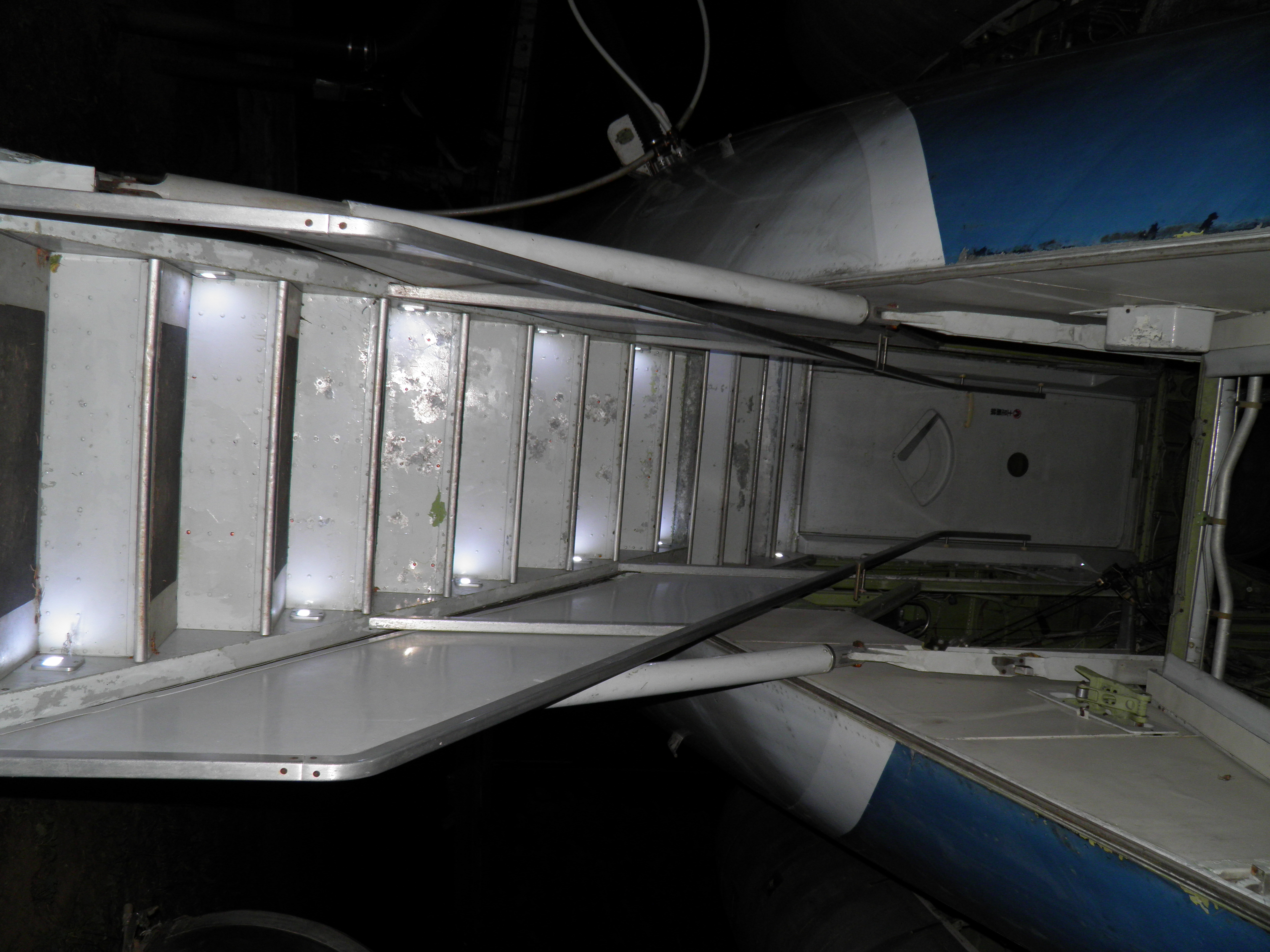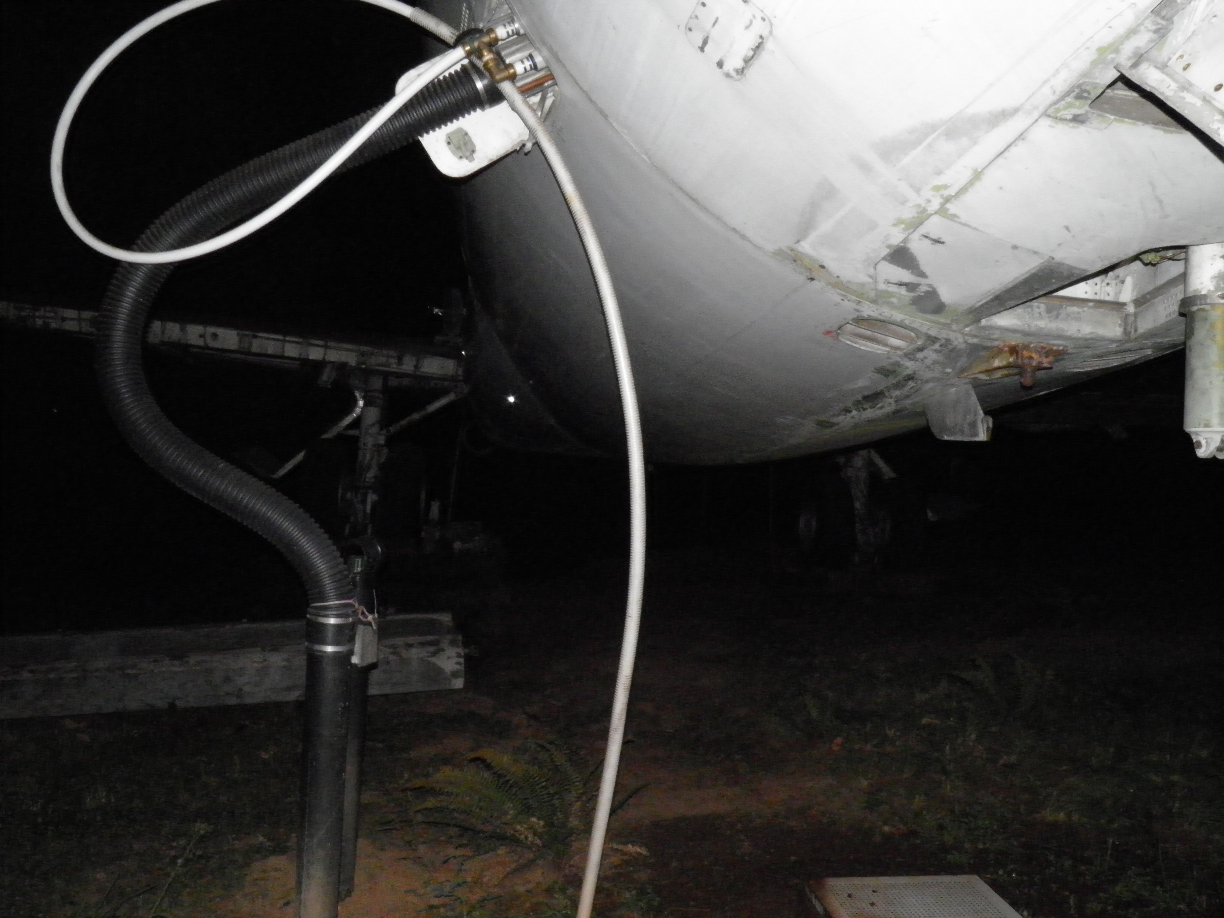 Exterior work included fabrication of a simple structure rendered from surplus computer room floor tiles which provides stair like access to the top of the right wing tip.  The same tiles were also used to fabricate a simple porch over the turf the air stairs rest upon when extended, plus an elongated landing surface for the aft drain mast which disperses the gray water which exits that mast so no soil erosion occurs.  In addition to functional benefits, these simple improvements significantly enhanced the visual appeal of the grounds.