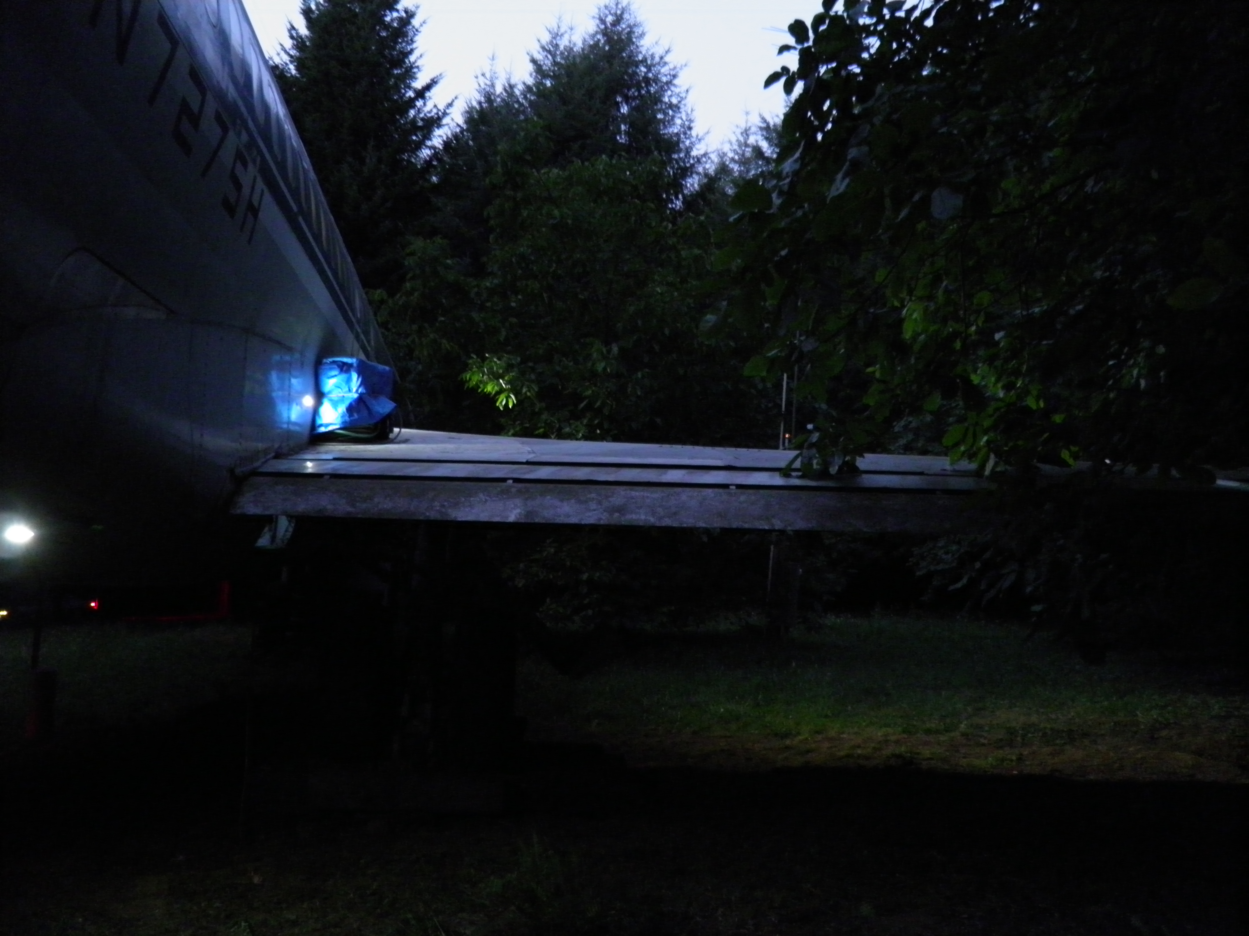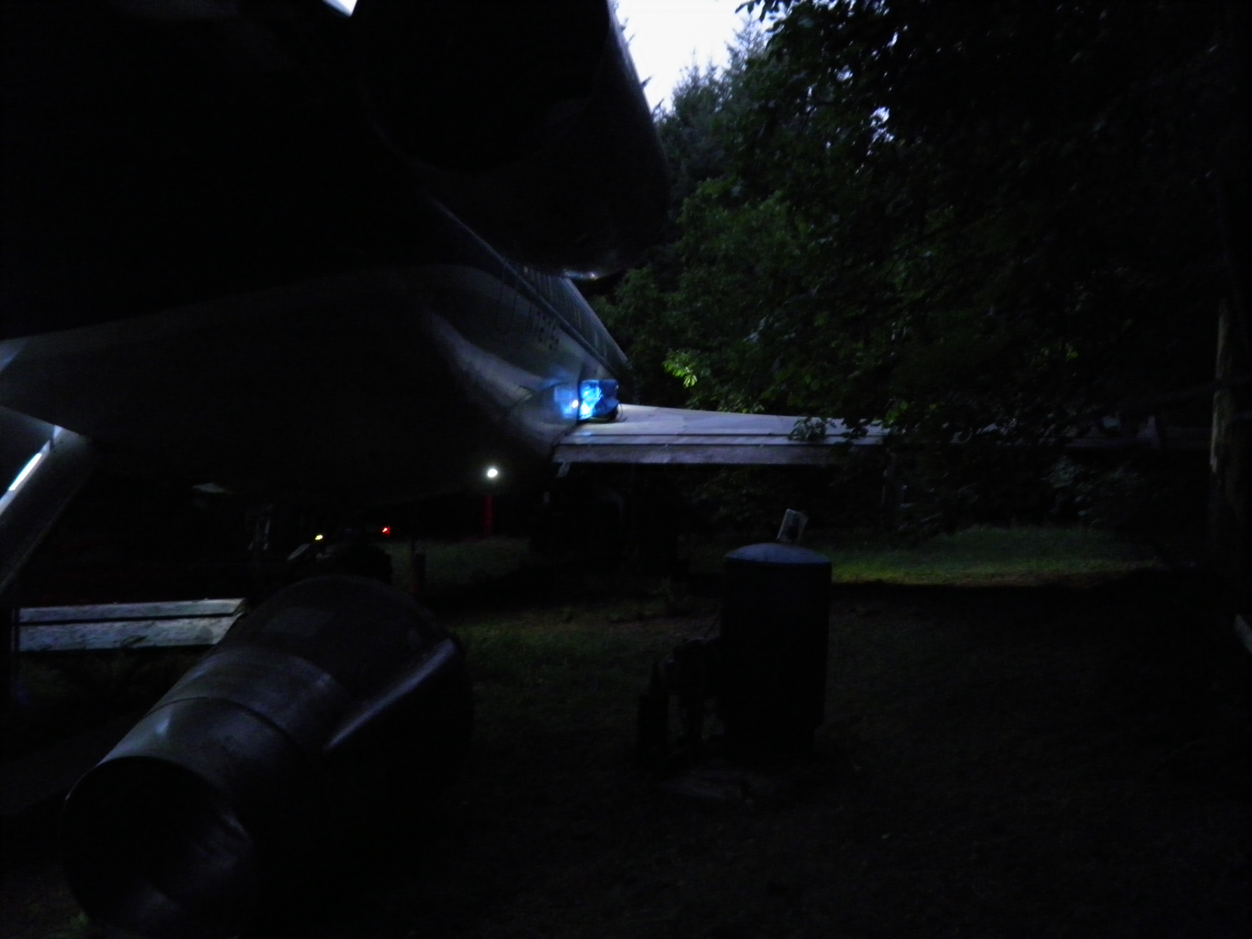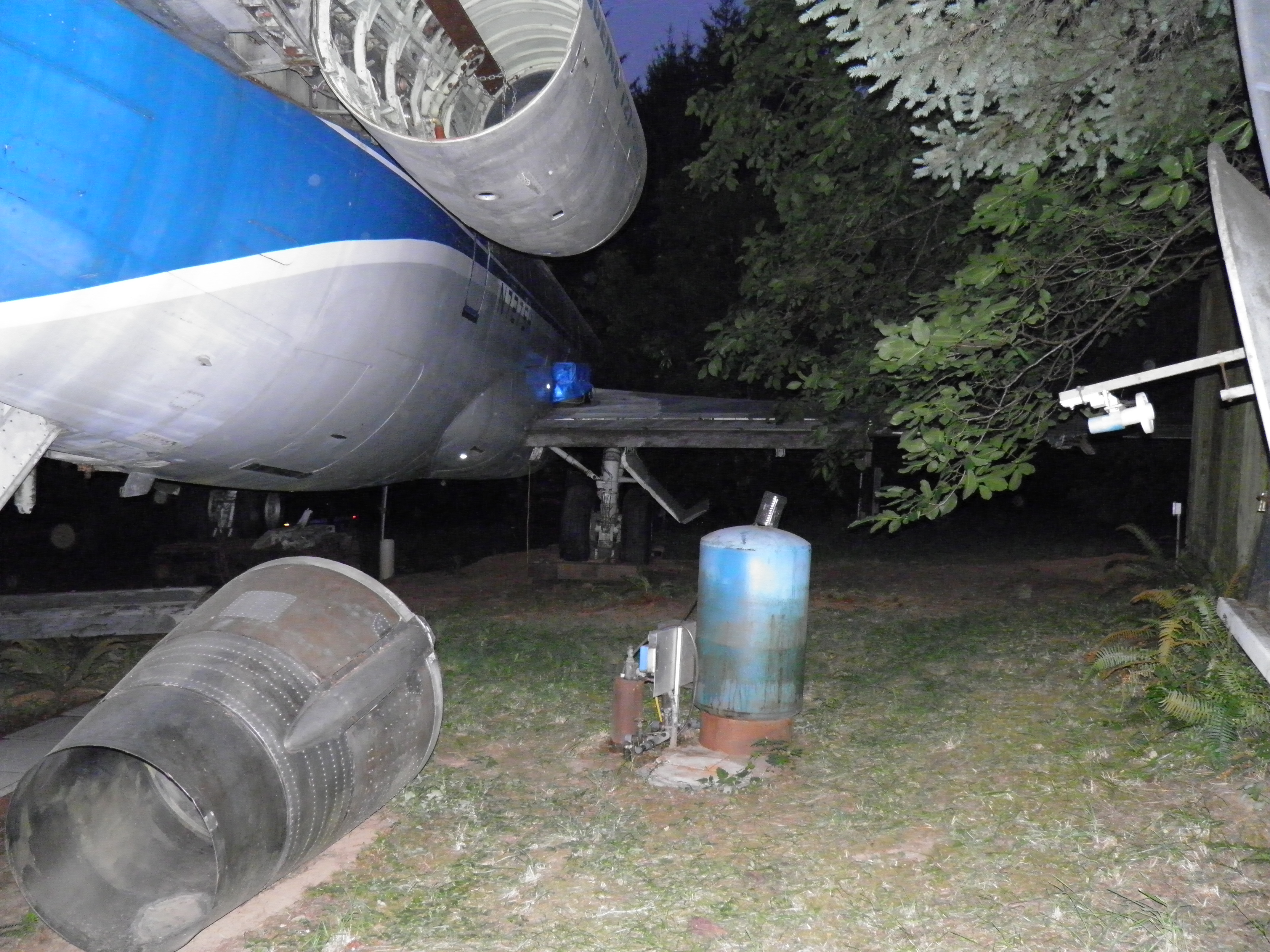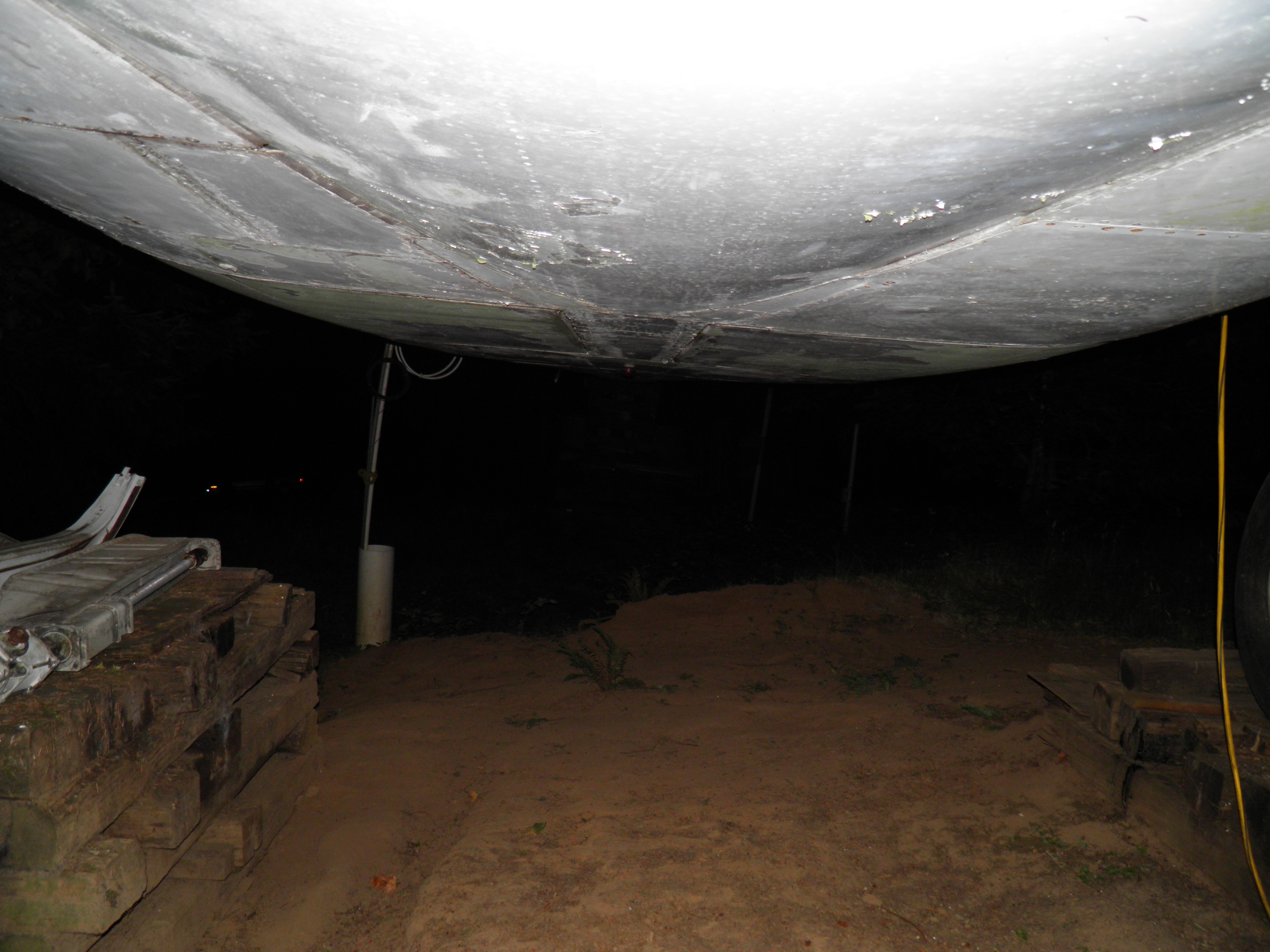 The third van, located behind the right wing, has been cleared of most material which was obsolete or unlikely to ever be utilized and thus is significantly lighter.  I plan to move the entire van to a new location near the west border of my property where it'll be essentially out of sight of the aircraft, immersed in mature Douglas Fir trees.  This will be a big task since, even though significantly lighter now, the van is still massive and thus nontrivial to move.  An old truck trailer will probably be required, and material will likely be cleared from the van in preparation for the move, then material moved back into the van after the move.  (A material swap will likely be involved at that time - personal domestic items will probably be moved into my aircraft, and currently unused aircraft components then moved into the van.) The van will likely permanently remain on whatever wheel structure is utilized in part to provide improved earthquake resistance, but also to facilitate any future repositioning which might be desired.  Although success seems unlikely, I hope to complete this task before winter weather arrives too.