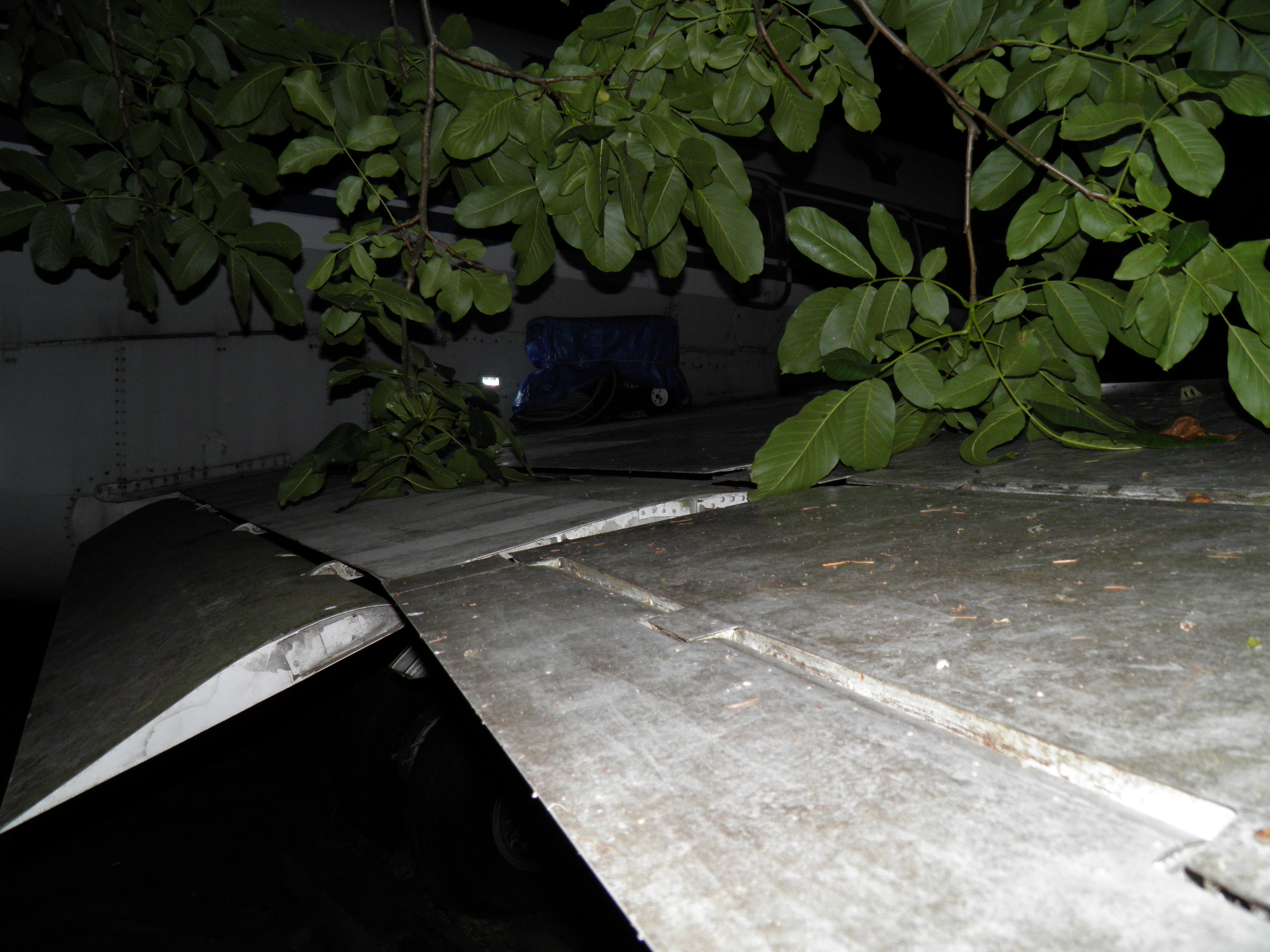 Additional substantial de-cluttering work occurred in the three gray storage vans located behind the right wing and in front of the aircraft.  The two vans in front now contain only a modest amount of material to be recycled or given away.  And the vans themselves are ready to be disposed of.  My hope is that they'll be acquired by a friend as soon as possible.  If that proves impractical, they'll be sold or given away by other means so as to clear the area to help beautify the aircraft's surroundings.  However, if both aren't taken by a friend soon, the south one may be cut into two sections, with the shorter roughly three meter section moved to a position under the left wing stub to facilitate support of the aircraft during construction of a permanent left landing gear pillar (with a bowl shaped top).  I'm eager to complete these tasks before wet winter weather arrives.  If possible...